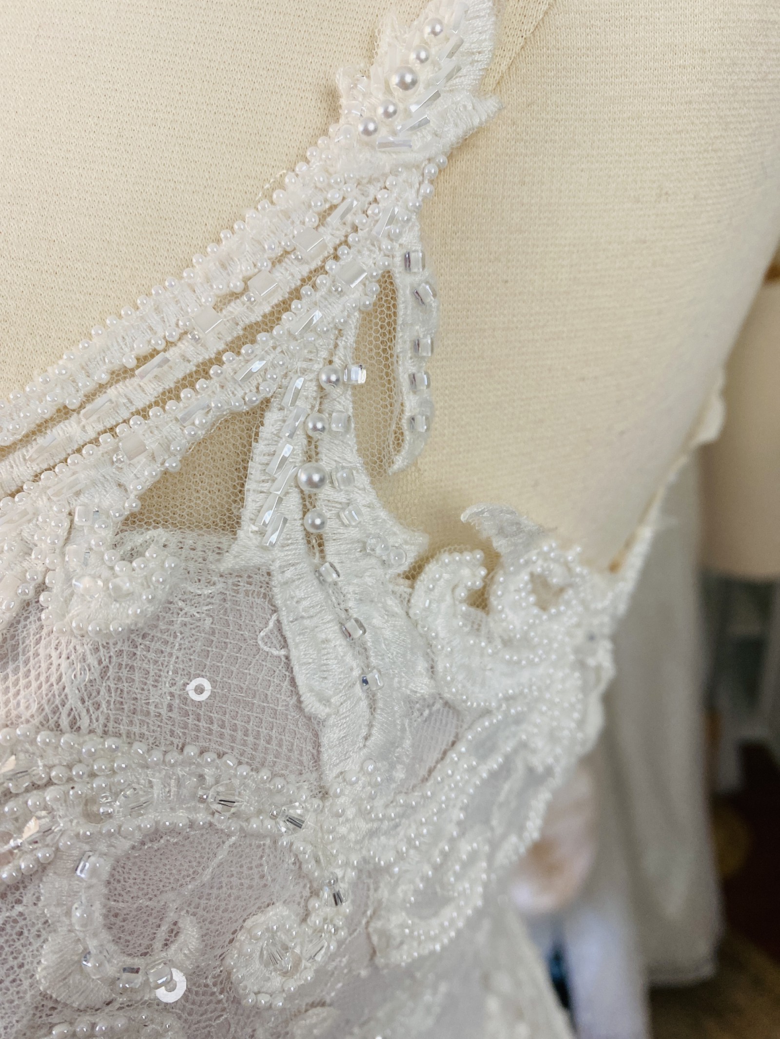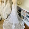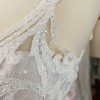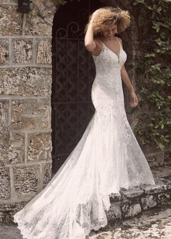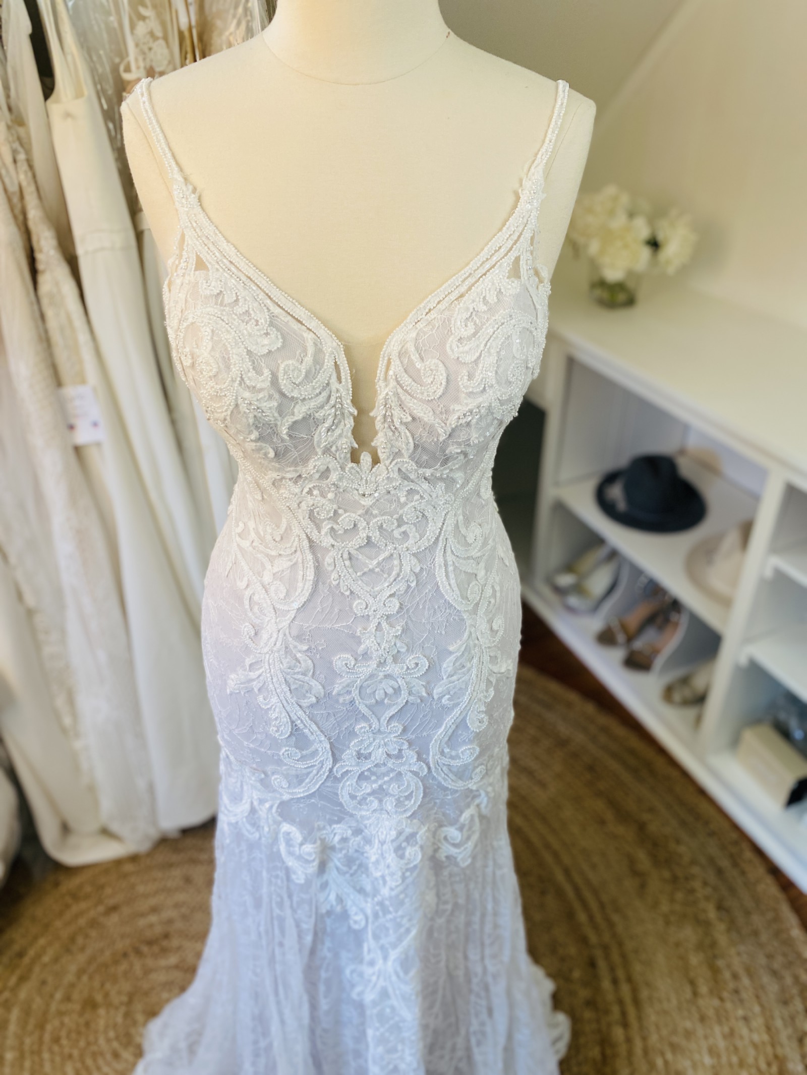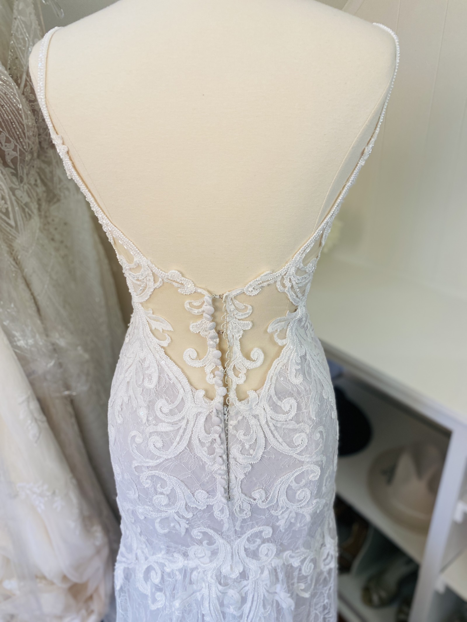 Maggie Sottero Esther is an alluring gown of shimmery textured lace! The deep neckline is mirrored in the low, sheer lace back. A layered train elevates this look completely.