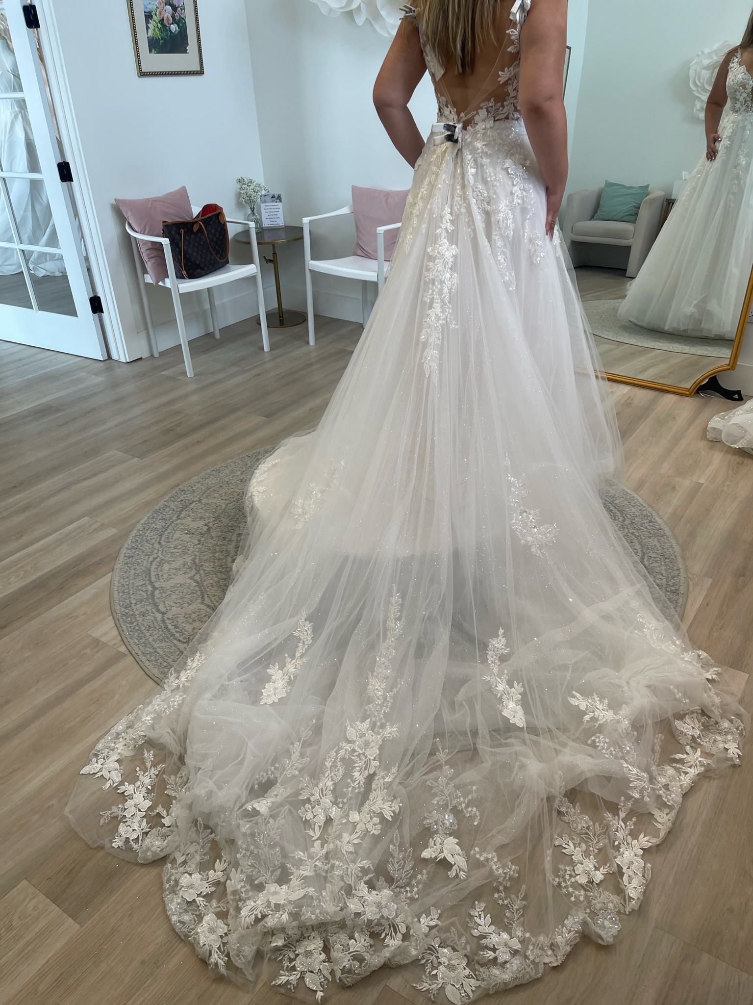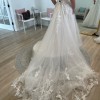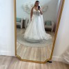 This Serenity wedding dress by Enzoani is a breathtaking choice for any bride looking to make a lasting impression on her special day. With its enchanting A-line silhouette, this gown flatters every body type while providing an air of elegance and grace. The delicate V-neckline beautifully frames the neckline, leading into slender straps that offer just the right amount of support and sophistication.