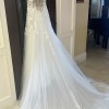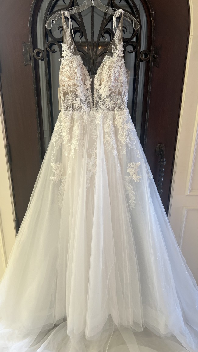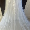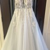 This Serenity wedding dress by Enzoani is a breathtaking choice for any bride looking to make a lasting impression on her special day. With its enchanting A-line silhouette, this gown flatters every body type while providing an air of elegance and grace. The delicate V-neckline beautifully frames the neckline, leading into slender straps that offer just the right amount of support and sophistication.