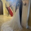 Crafted from luxurious tulle, this floor-length masterpiece shimmers with intricate beading, crystals, and embroidery that catches the light with every movement. The low back adds a touch of sensuality, ensuring that this dress is memorable from every angle. The subtle sequins and pearls are thoughtfully placed, enhancing the overall aesthetic without overwhelming its refined elegance.