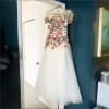 Gorgeous cream base colour with beautifully bright floral embroidered details, metallic silver thread and sequin embellishments, crystal buttons at back of neck and multiple layers of luxuriously light tulle in the skirt.