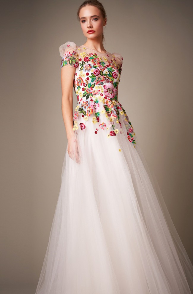 Jenny Packham’s bridal designs will always illicit a murmur of 'wows from wedding guests, but theres something about the Carole gown that feels truly mesmerising. Introducing forward-thinking brides to a world of colour, the floral embroidery detailing thats scattered from the sheer neckline right down to the waist recalls the haphazard way that confetti lands when thrown in the air: each bloom appears naturally placed, as if fallen from the sky.
