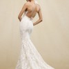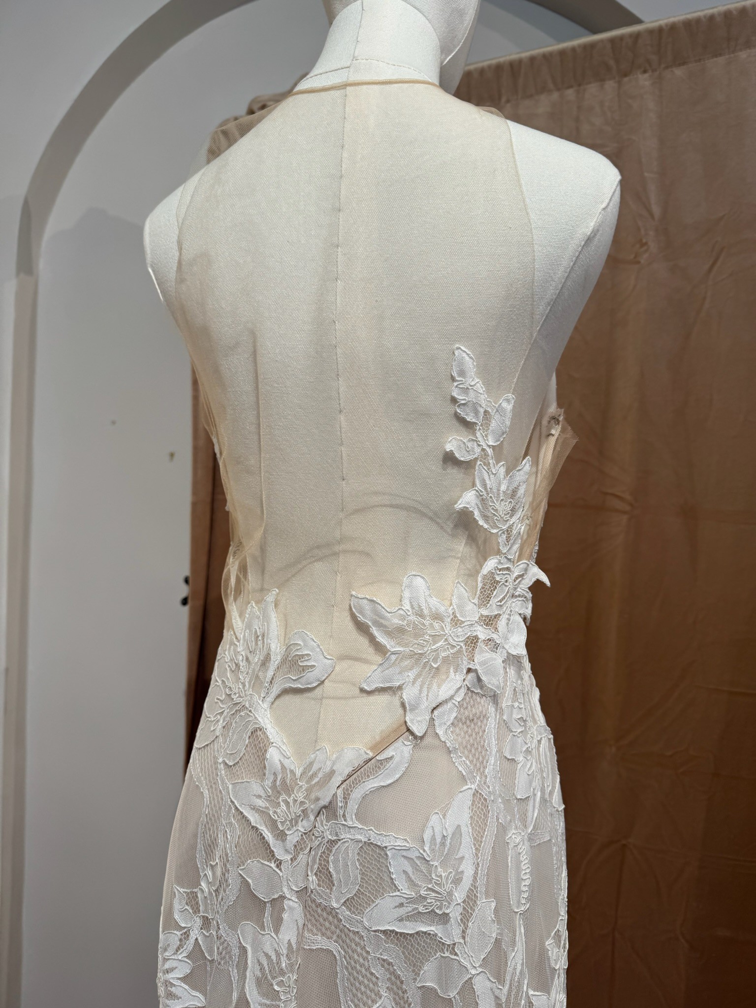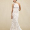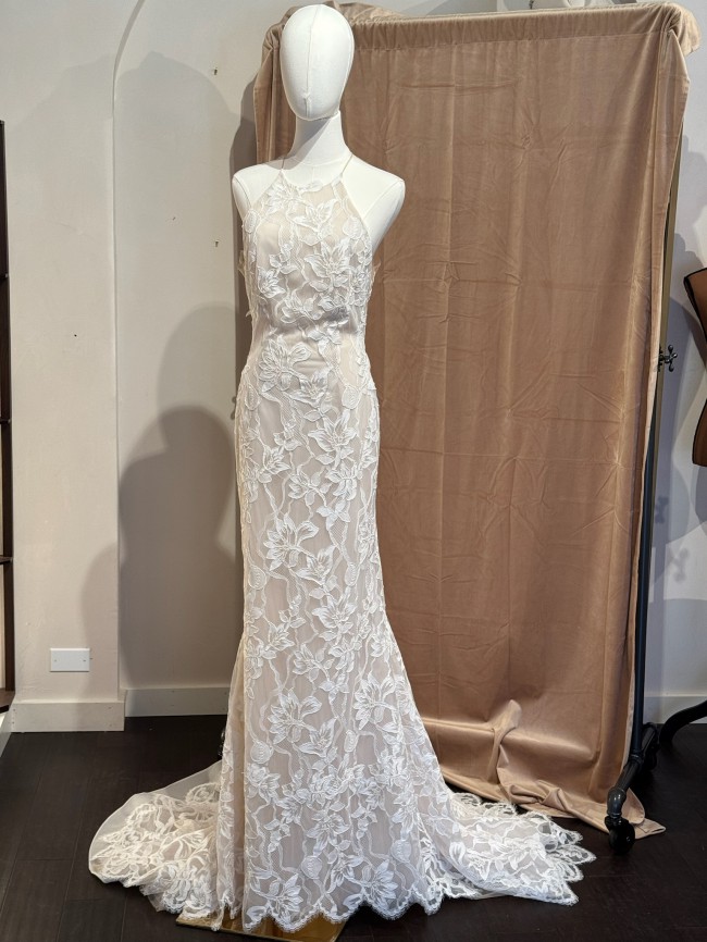 Sleeveless halter neck soft trumpet gown with accent flower detail and signature low back with lace tattoo.