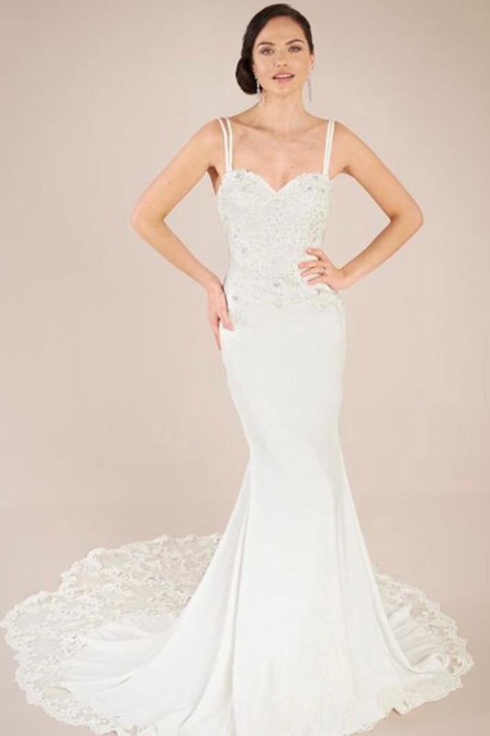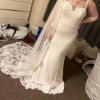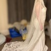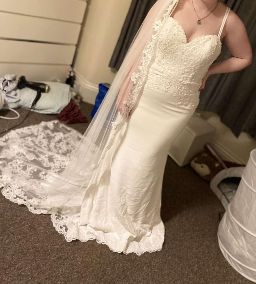 This dress is ivory in colour and comes with a full length veil which matches the lace & beading details on the dress.