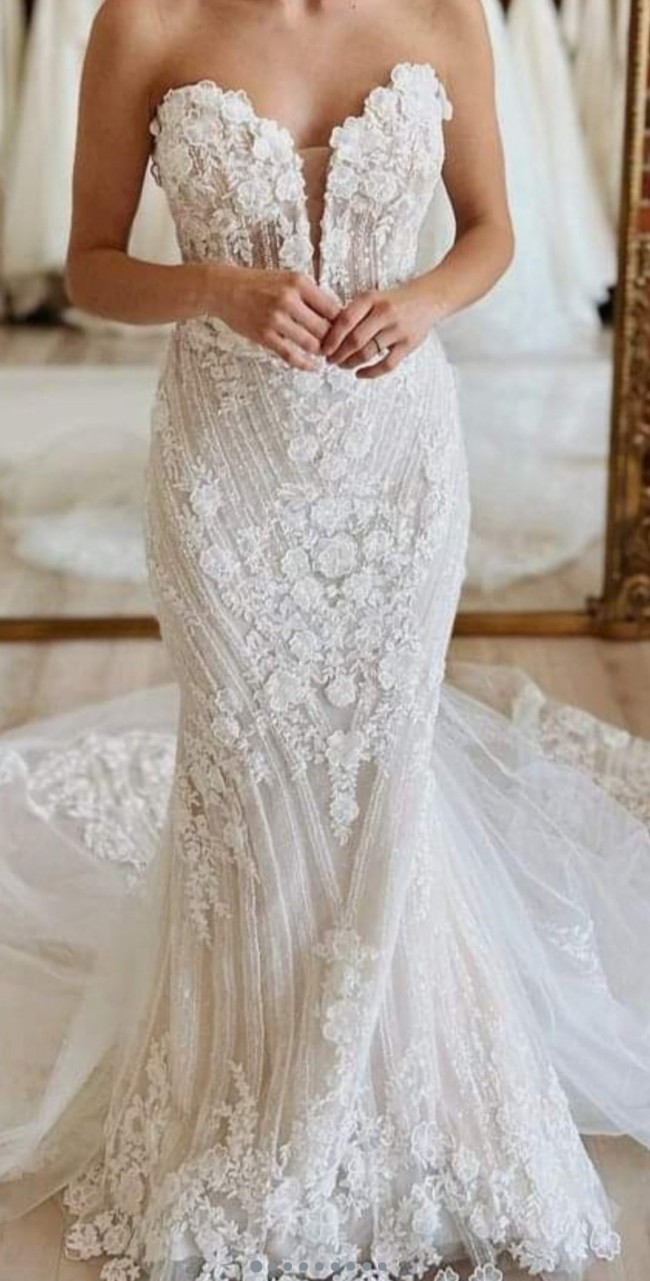 Dress has been altered to add two beaded straps (which can be easily removed if you’d prefer strapless) and two cups sewn in (can also be easily removed). I’m 34B, wear size small in most tops and some XS. Wear size 2-4 or 26 in jeans. I’m 5’4 and wore this dress with flats, if you are 5’5 and taller this dress would not fit as this hit the ground perfectly for me. Dress is in overall great condition except for a little dirt underneath the nude skirt at the bottom. It also has one area where the bottom tulle was ripped and one bustle hook came undone. All of this can be fixed with a trip to the dry cleaners. If you have any questions or want more info, let me know. This was my dream dress and I would love for someone else to enjoy it!