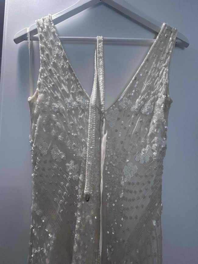 “Unique and polished. The Fontanne wedding dress is refined elegance with statement sequin panel lines framed by a V-neck bodice and figure hugging bias cut skirt. Due to the elaborate beading and sequins, this dress is especially flattering across all shapes and sizes.”
