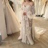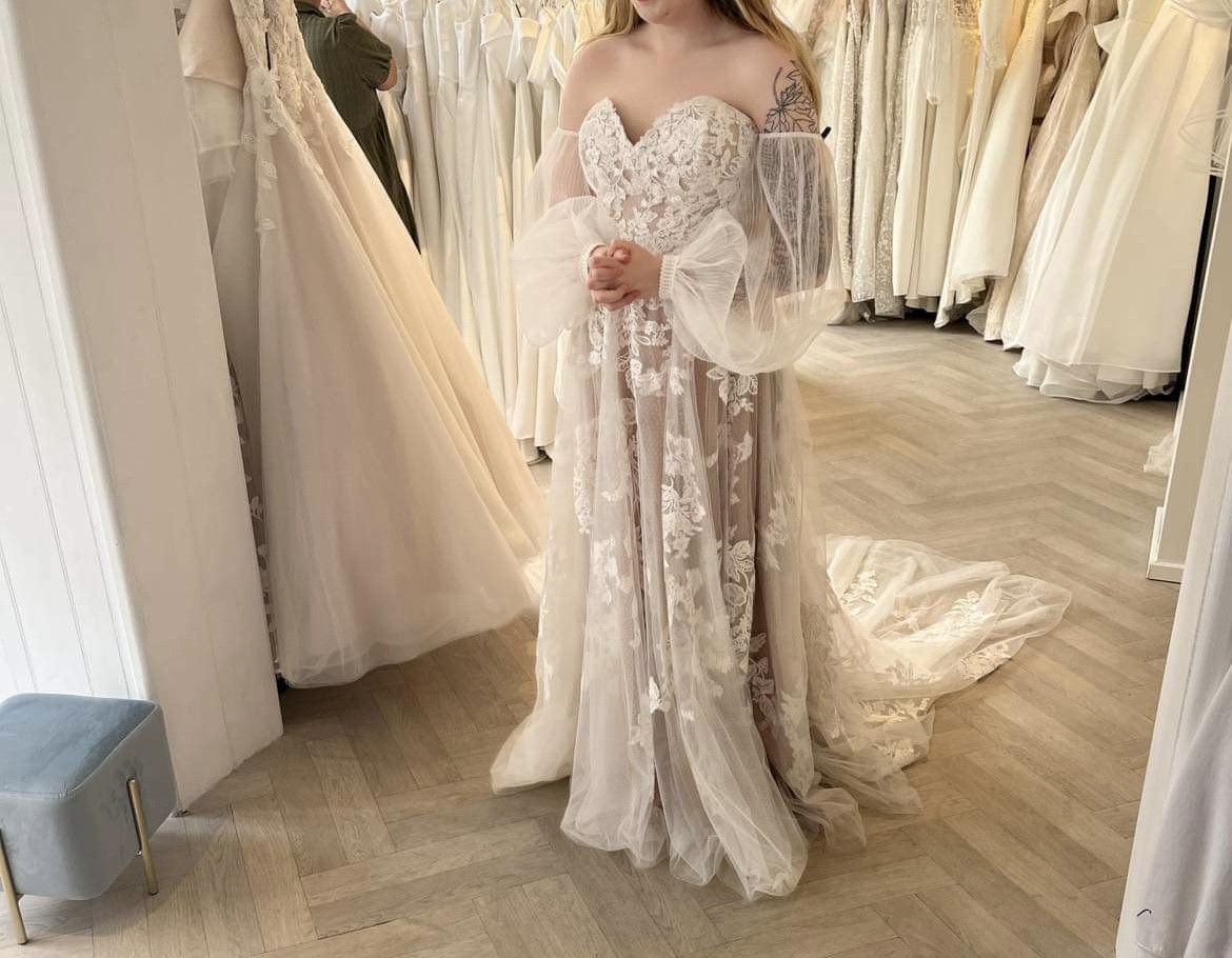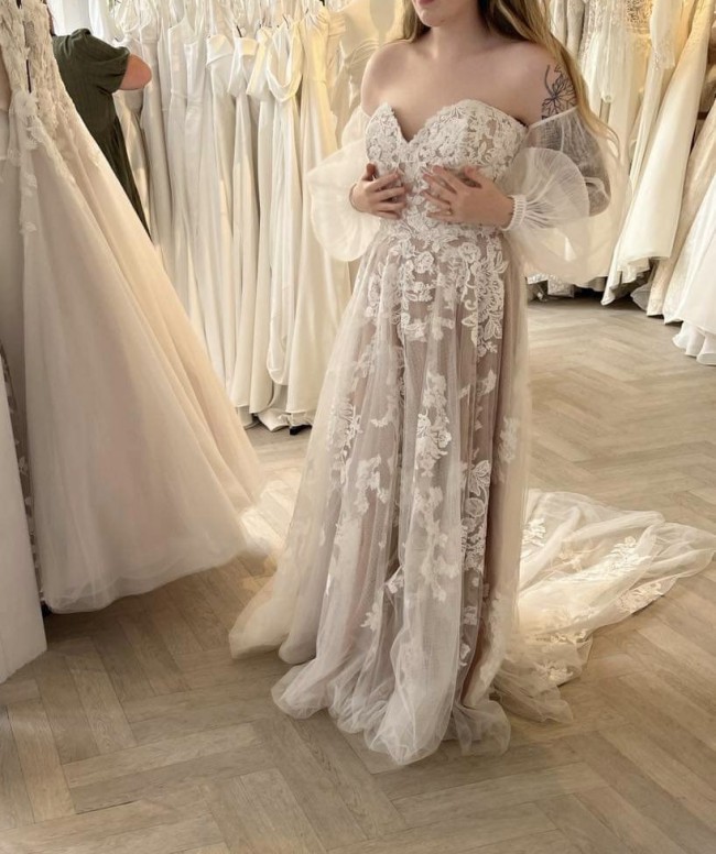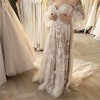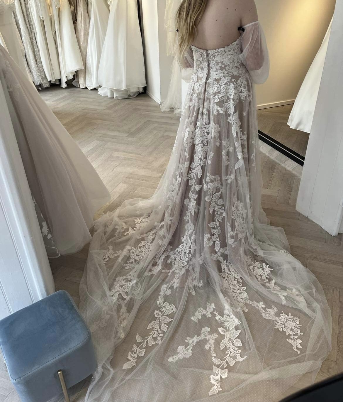 Carson Dress by Sottero and Midgley. It is an ivory dress with a mocha base layer, fully embroidered and has a thigh length slit on the left leg side.
