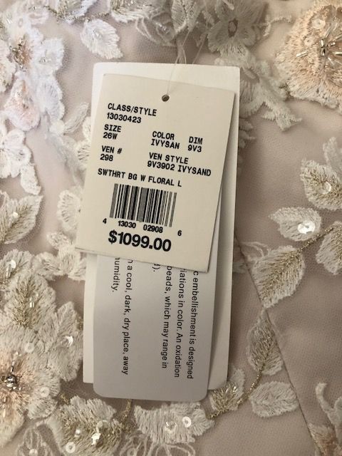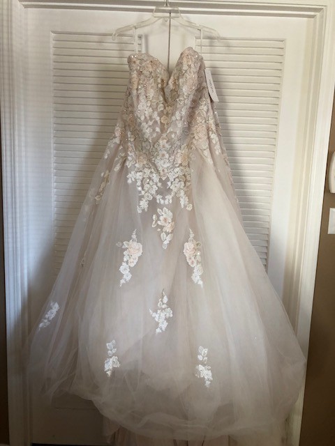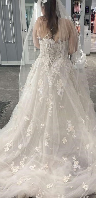 This dress was never worn or altered. My DIL changed venues and a different dress was desired. You can remove some tule underneath to have more of an A-line silhouette. It comes with a matching cathedral length veil that could be shortened but still keep the beautiful detail. Veil price was $299.00, style #V10019.
