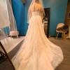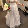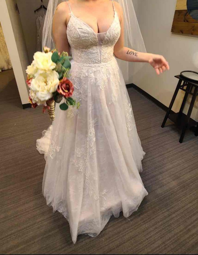 Beautiful blush gown with Chantilly lace overlay and 3D floral appliqués. Only worn to try on. Really stunning details and it’s so very light, it would be perfect for a spring or summer wedding.