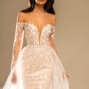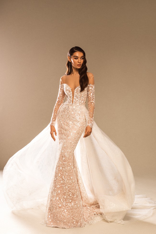 Effortlessly stunning, this bridal style provides a tailored, narrow silhouette from neckline to hem. Sheaths are traditionally lighter than their full-skirted sisters and offer a body-hugging silhouette. This gown looks best on slender, petite, and hourglass frames. Overskirt is not included.