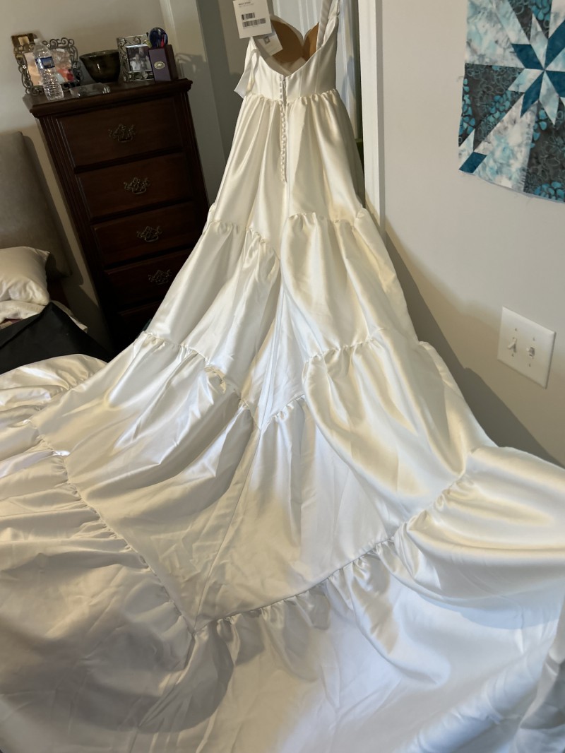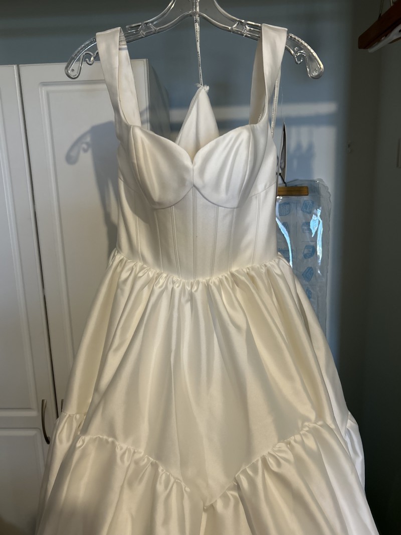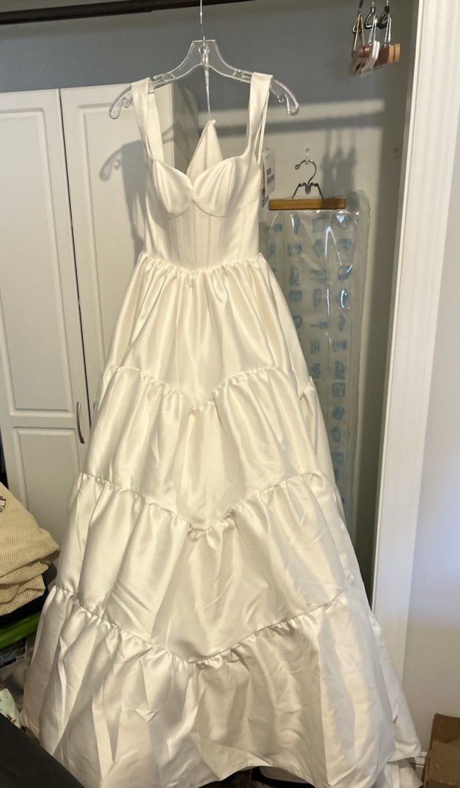 Stunning corseted ruffle skirt gown. Whimsical and cloud-like layers. Never worn, no alterations. Version without tied straps.