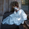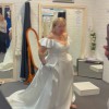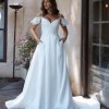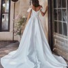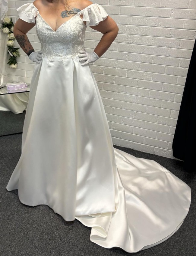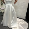 The Samantha dress is a stunning piece that exudes elegance and sophistication, made with high-quality Mikado Satin fabric. It features exquisite beaded lace applique on the bodice and flat thin straps for added glamour. The detachable flutter sleeves offer versatility, while the full A-line skirt with inverted box pleats flows into a chapel train for a dramatic effect. Crafted with attention to detail, including an inner bra cup, boning, and medium-weight interfacing, the dress provides support and comfort. It has a secure zipper back closure and is fully lined for a luxurious feel. The Samantha dress is the epitome of elegance, making a lasting impression on your wedding day.High-quality Mikado Satin fabric