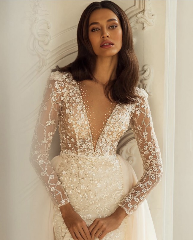 What truly sets this dress apart are the exquisite embellishments. Adorned with delicate 3D flowers, intricate embroidery, and sparkling sequins, it captures the light in the most magical way. The puff sleeves give a modern twist while providing a timeless charm that echoes classic bridal beauty.