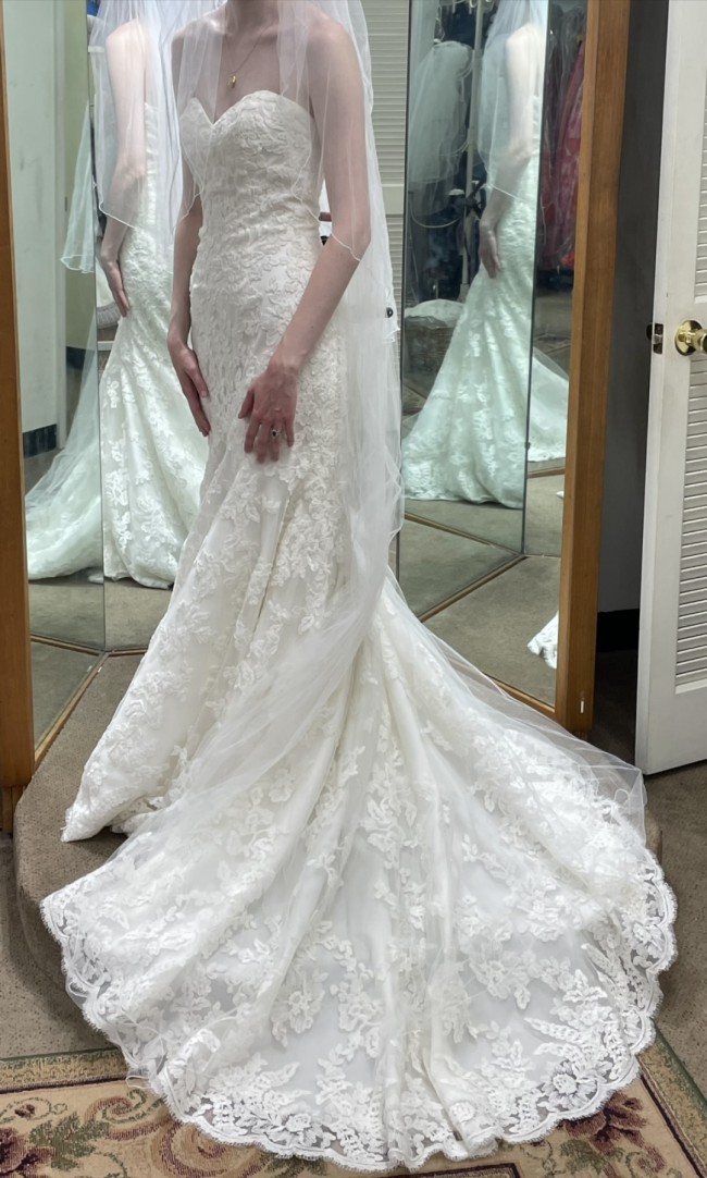 Bought it online but never had it altered and never wore it. The dress in the pictures is a dress size 6, I then bought the dress size 8 online. I'm a street size 2-4 and I did not have it altered for reference so it is still a dress size 8.