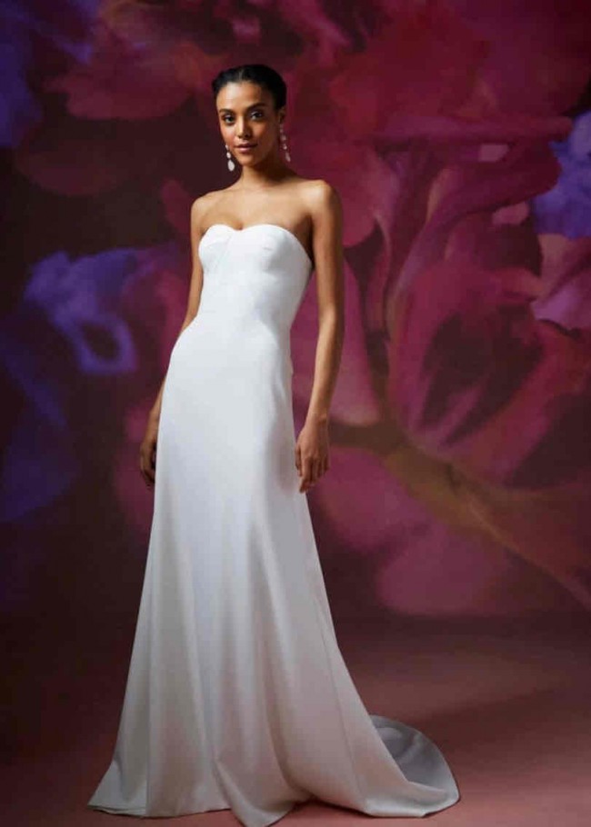 Gorgeous Sample that is in perfect condition from our Bridal Store💕 Theia Peridot is a minimalistic crepe gown that has subtle details such as a sweetheart neckline and short train