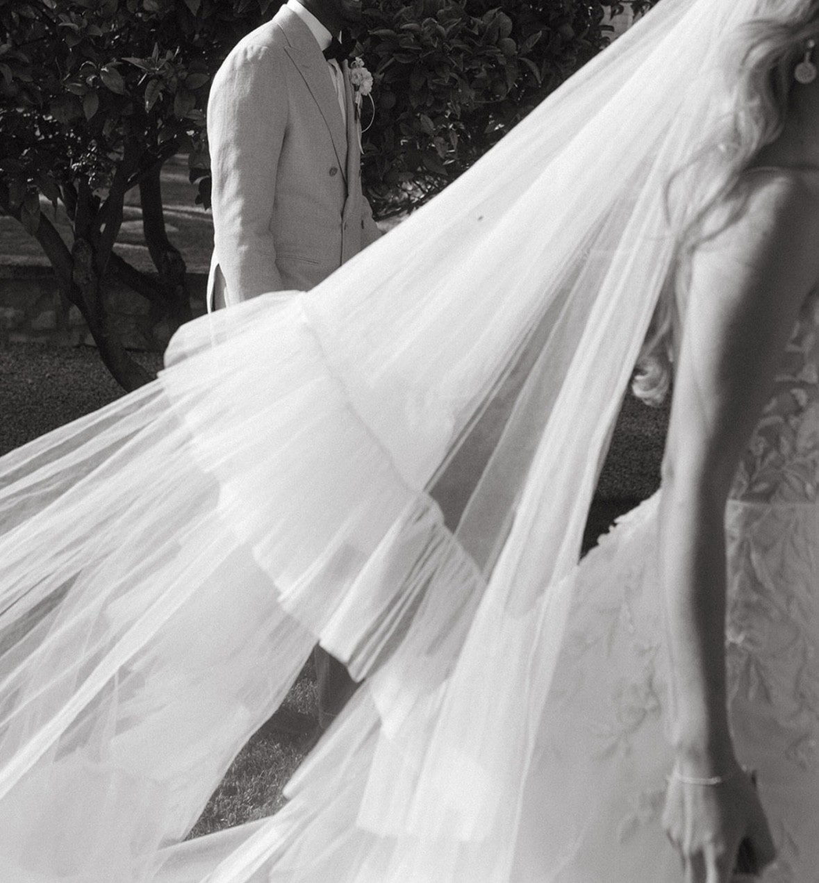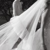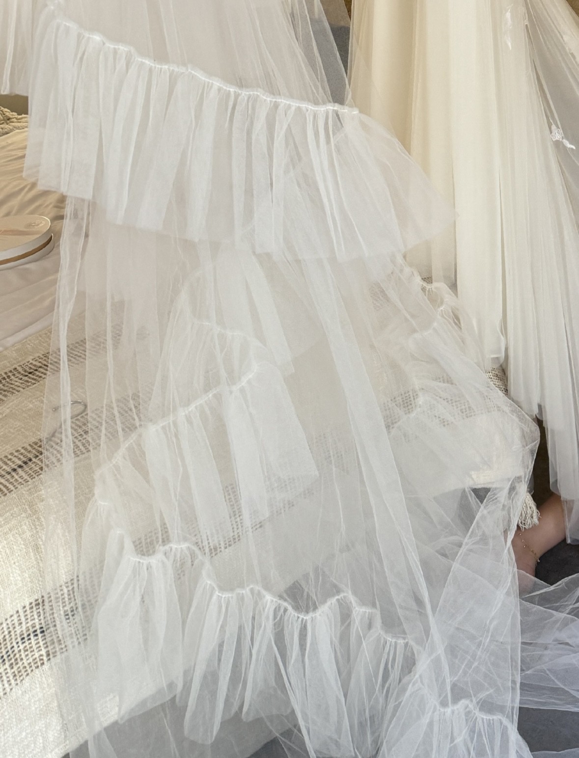 This beautifully soft veil is 3 meters long to give extra drama. The second tier (also known as the blusher) is 28 inch from comb to end. This is traditionally worn over your face but now a days can be worn behind the head for extra volume. The veil has a gorgeous deep tulle ruffled edge all the way around.
