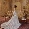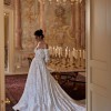 Fabulous A-line wedding gown with long detachable sleeves. The semi-transparent corset is adorned with spectacular lace featuring large floral patterns. The dress includes a shimmering lining and a graceful train.