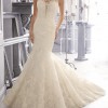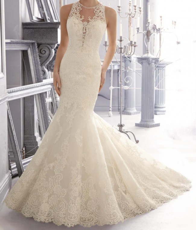 This enchanting Morilee dress, model 2683, captures the essence of romance and elegance, making it the perfect choice for your unforgettable day. The trumpet silhouette beautifully hugs the curves, flaring out just at the knee, lending a timeless grace that flatters every figure. Crafted from exquisite ivory lace, this gown boasts a sheer neckline that adds a touch of allure, making you feel radiant and ethereal as you exchange vows.