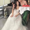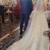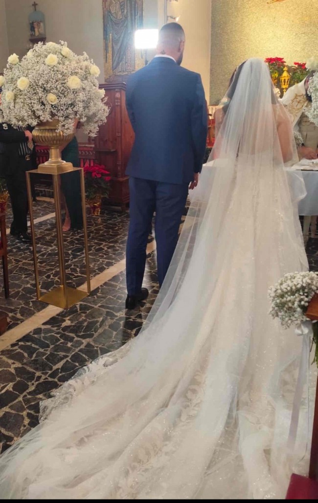 This gorgeous Aline gown has made my day so beautiful … it has it all… sweetheart neckline, sparkly lace appliqué bodice , a sexy low back and a dramatic gorgeous long train! Everyone was telling me how beautiful my dress was even outsiders on the wedding day. At the reception you can clip the long tail at the back as shown in second picture the shorter version of dress. There is a gorgeous headpiece I can give free together with the veil