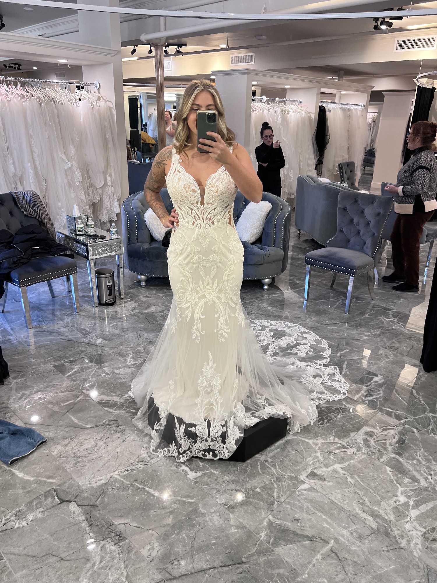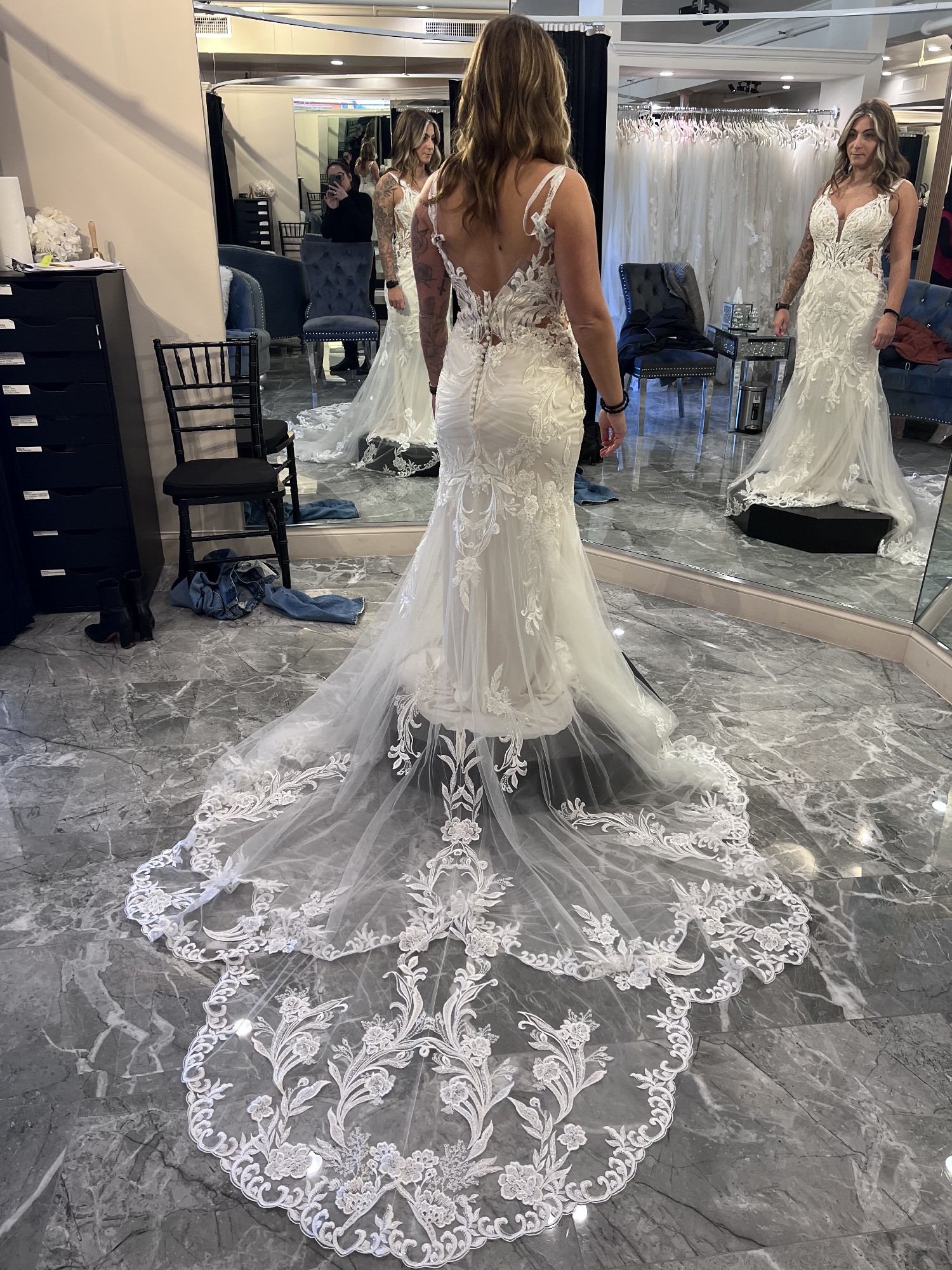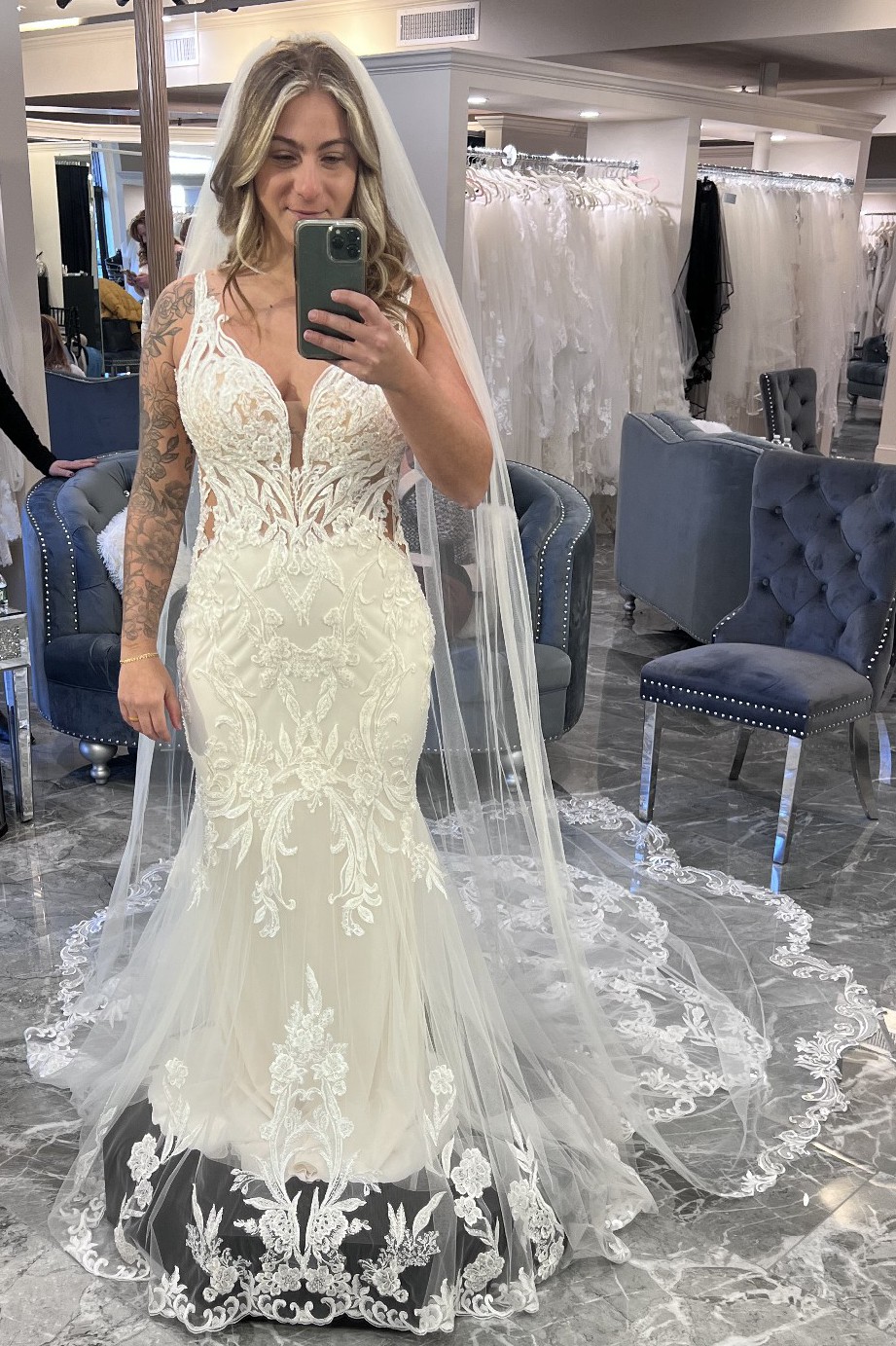 This stunning Francesca dress by Etoile embodies elegance and modern sophistication, making it the perfect choice for the contemporary bride seeking a touch of romance on her special day. The exquisite lace fabric envelops the silhouette in delicate detailing, while the exquisite mermaid cut beautifully accentuates your figure, creating a captivating hourglass shape that promises to turn heads as you glide down the aisle.