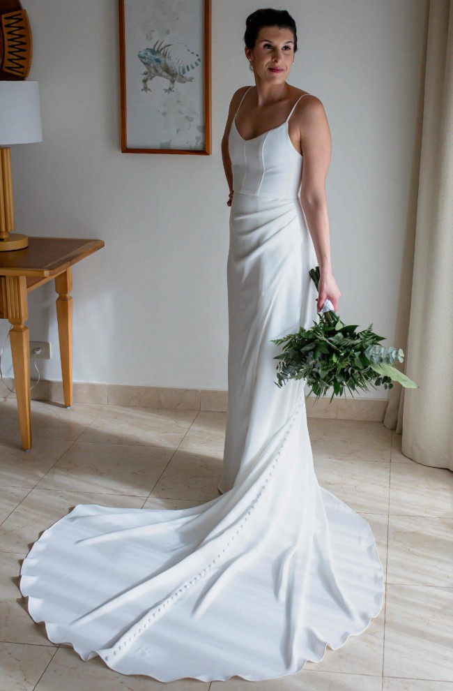 Classic and timeless. The dress is comfortable, silky, and shaping. I wish for this dress to go to a wonderful bride.