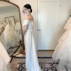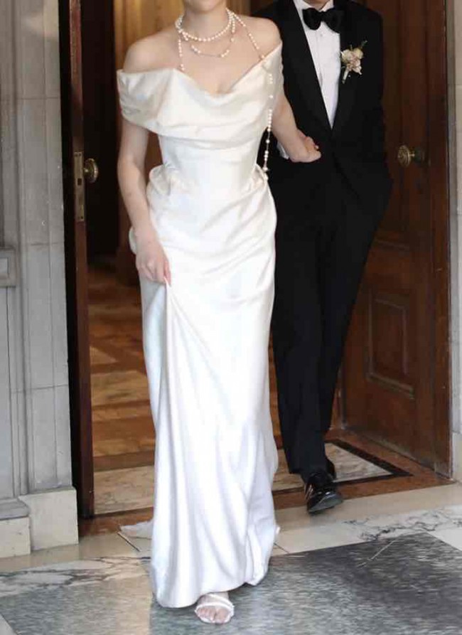 This is a Vivienne Westwood Long Cocotte dress from the ready-to-wear bridal collection. It has a fitted and boned bodice/corset, zip and hook and eye fastenings and beautiful heavy silk-satin fabric in pearl-white. The straps can sit off-shoulder or they can be pulled up and pinned to create on-shoulder straps. Dry cleaned to new condition with no flaws.