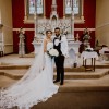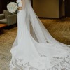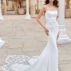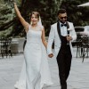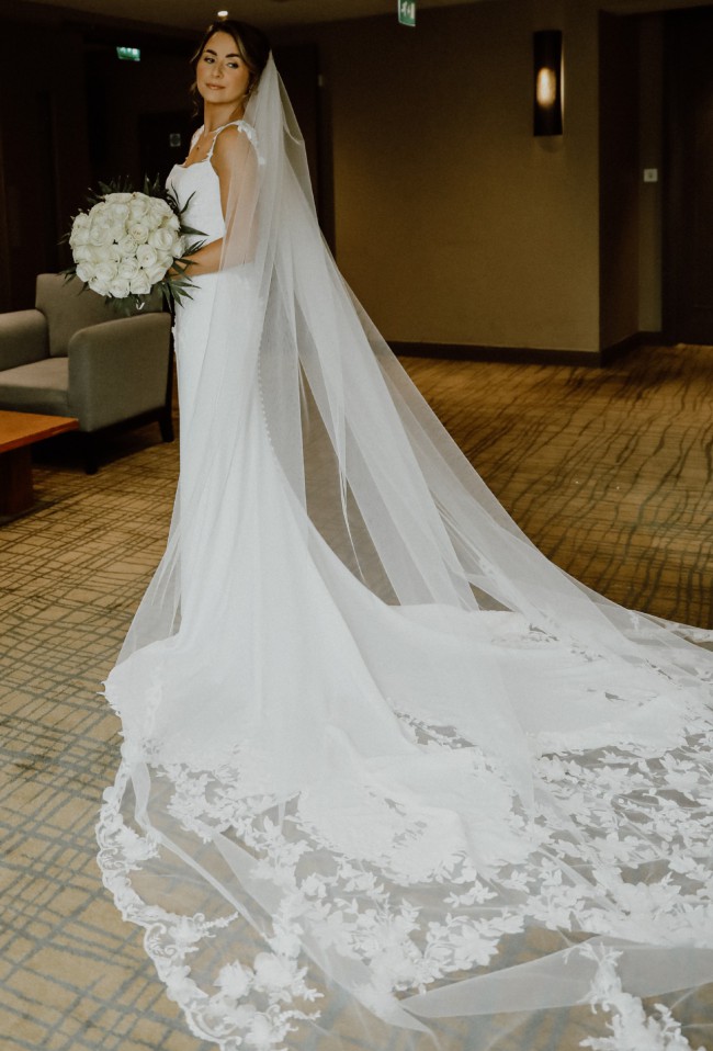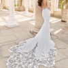 Effortlessly stunning, SINCLAIR is a crepe sheath gown that falls gracefully into an exquisite beaded floral embroidered lace and tulle train with a dramatic scalloped hem. She balances the minimalist look with sparkling, 3D beaded floral motifs sprinkled throughout the bodice. Her modern square neckline and delicate spaghetti straps add a clean look, leading into an alluring open back with intricate lace detailing.