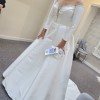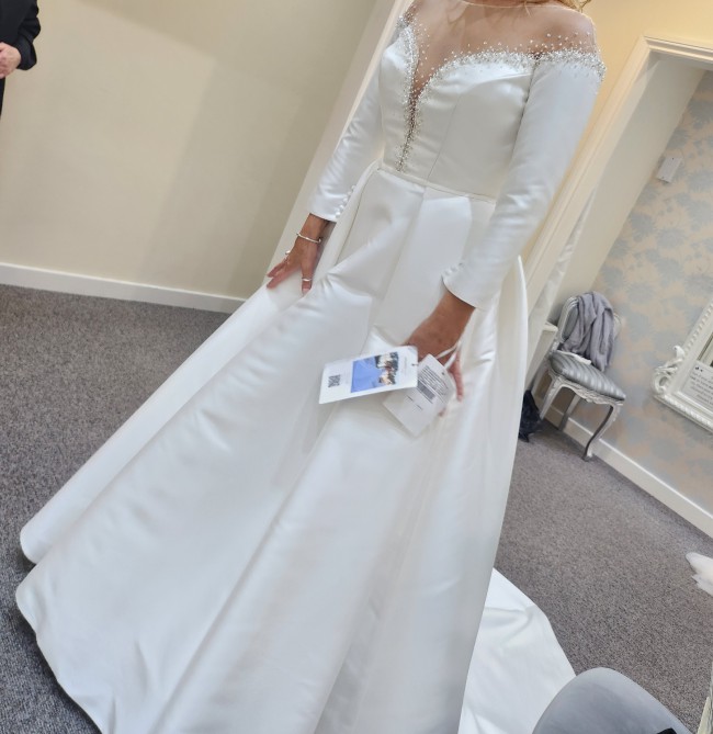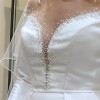 Beautiful Pronovias mikado satin ballgown. The embellishments to front and back add glamour to the elegance of the dress. The feel and look of the material is quality. The back has crystal buttons to the waist. No alterations made. Dress has been dry cleaned.