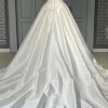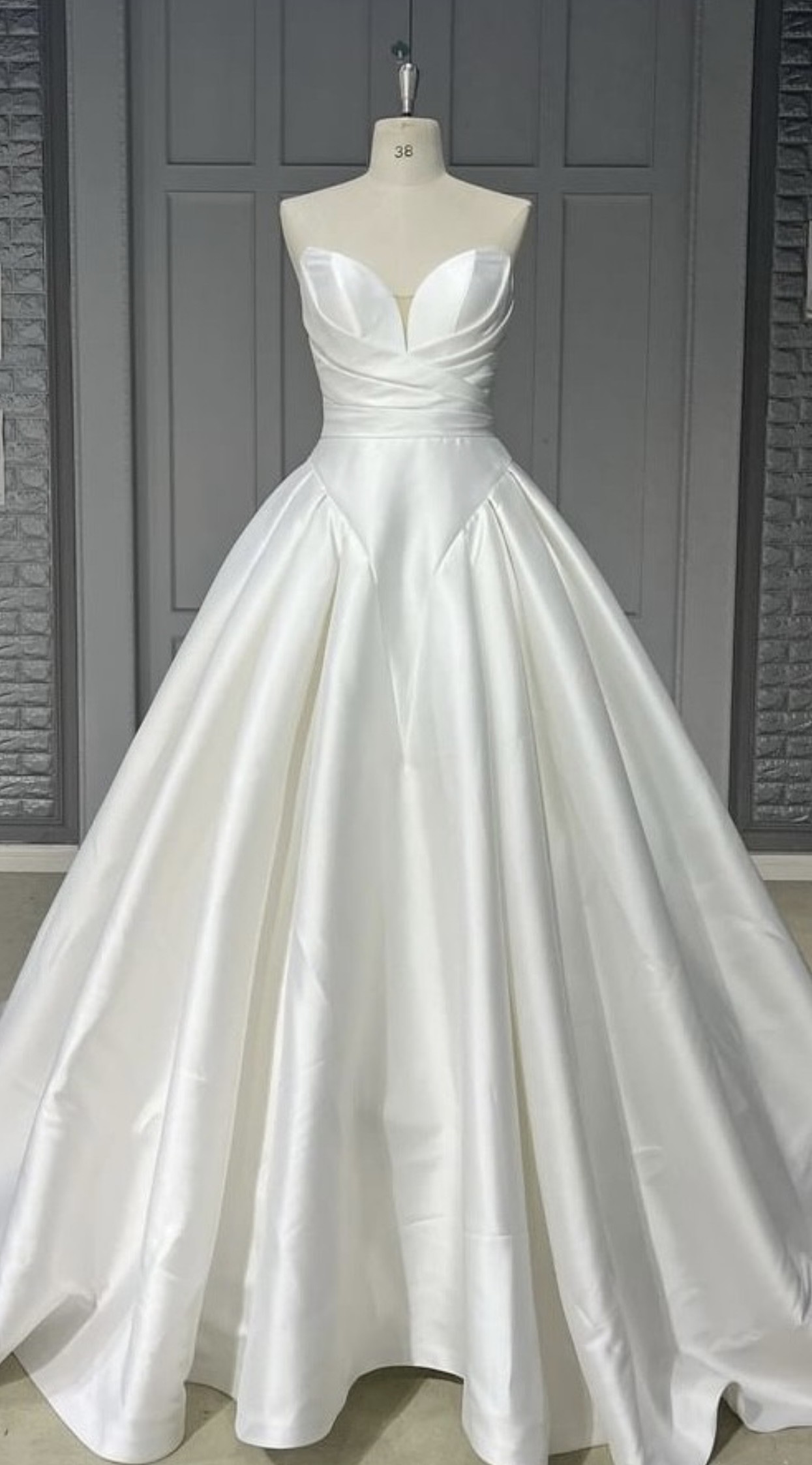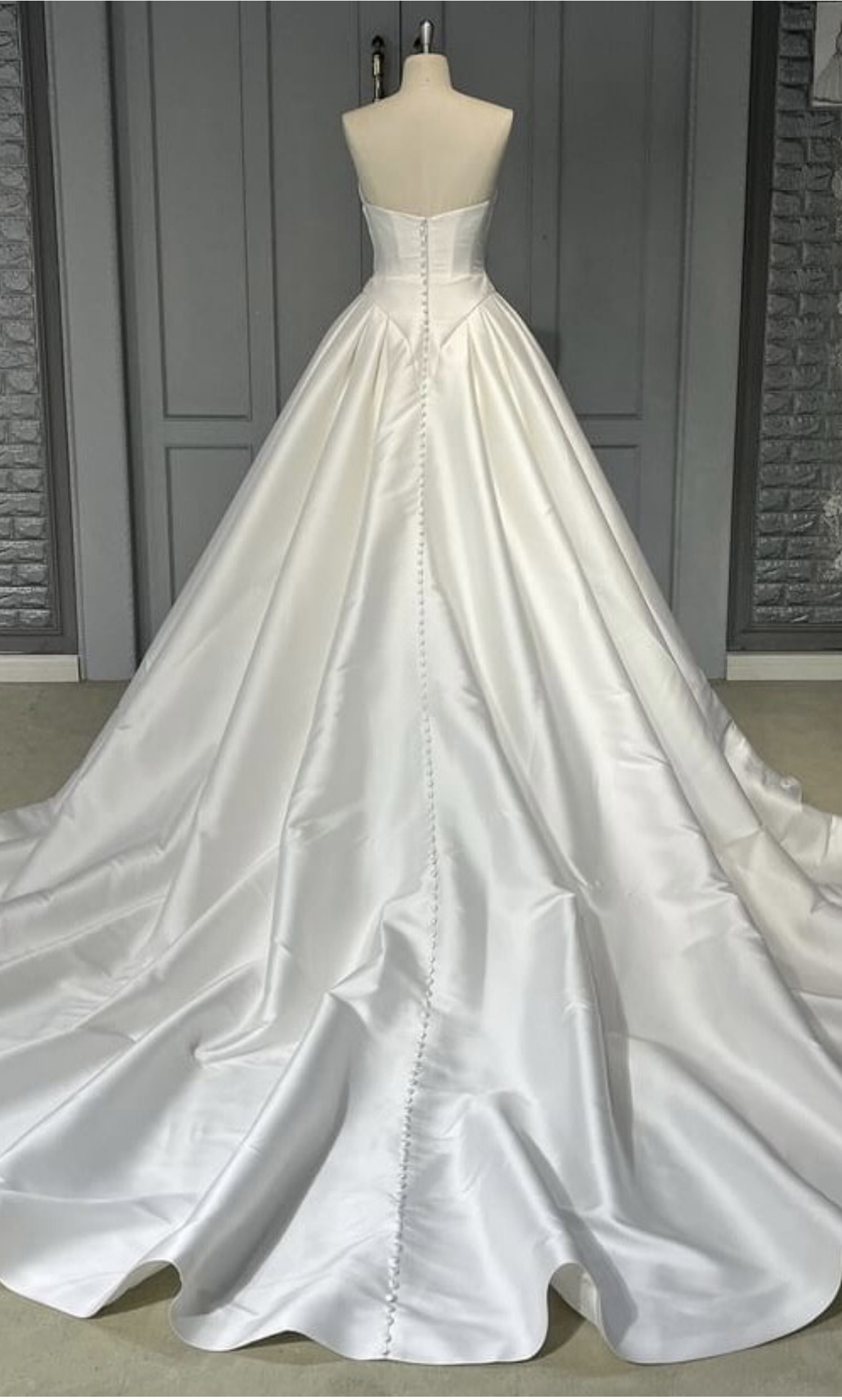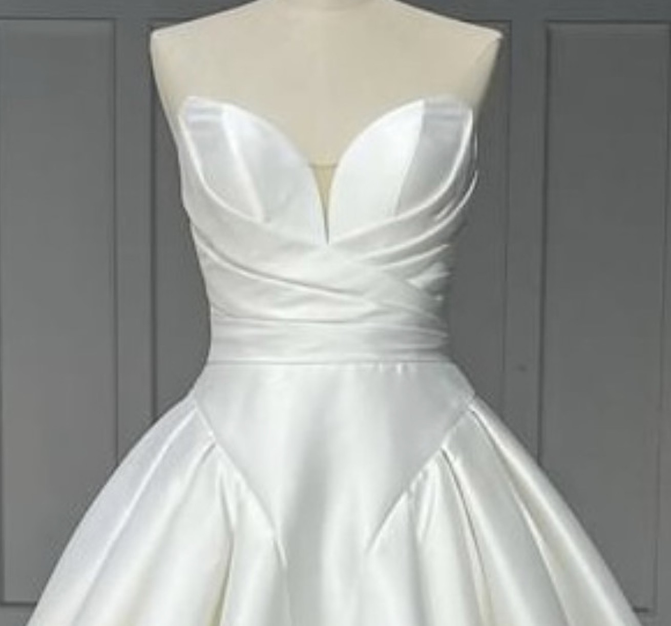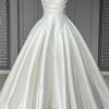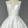 Gorgeous modern ballgown with plunging sweetheart neckline, natural waistline ballgown shaped skirt, and princes seamed basque shape perfect for the trend setting bride. Made of MIKADO with cathedral length train and buttons down the skirt