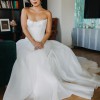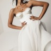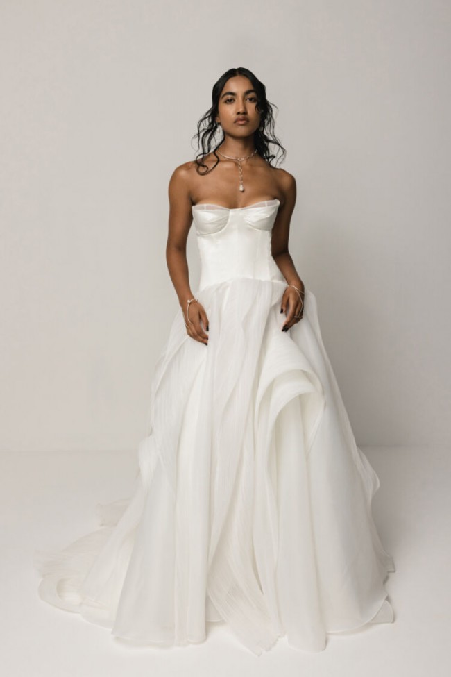 Created for the modern romantics, Salomé redefines classic bridal designs into a new realm. This gown stuns with a dropped waist textural silhouette that blends contemporary elegance with timeless charm. The structured Mikado bodice embraces the body with grace and poise, while pleated organza gracefully cascades through the skirt, creating ethereal canopies and arches and a soft, contemporary look.