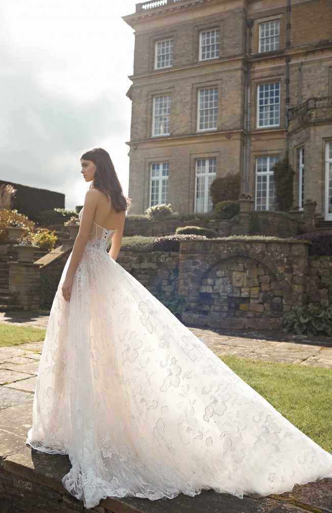 This authentic Gala 505 dress is stunning! Noted by its oversized floral motif embellishments, the embroidered silk ball gown features a draped corset and sweetheart neckline; added tulle and straps (can be worn without straps as well). There is a two-tiered veil included - please message me if you want to see more pictures.