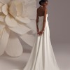 Amalfi by Eva Lendel, a modest and elegant fitted straight silhouette dress with asymmetric corset detail over the neckline and detachable feather floral belt over the fluid skirt.
