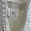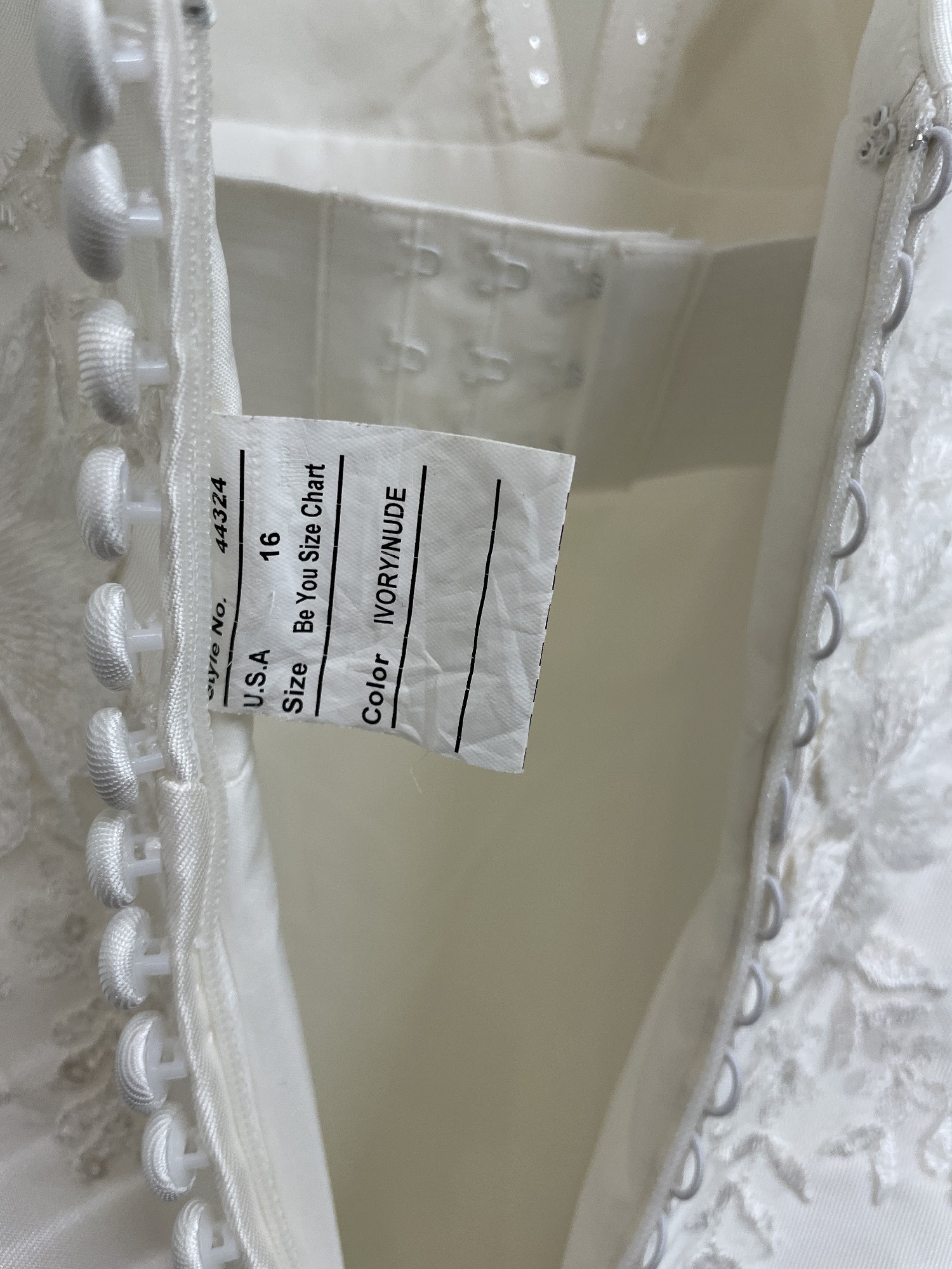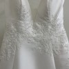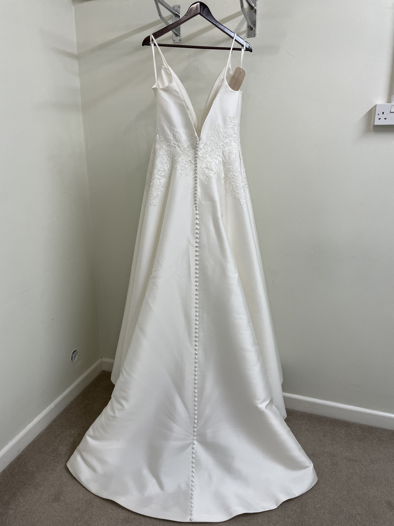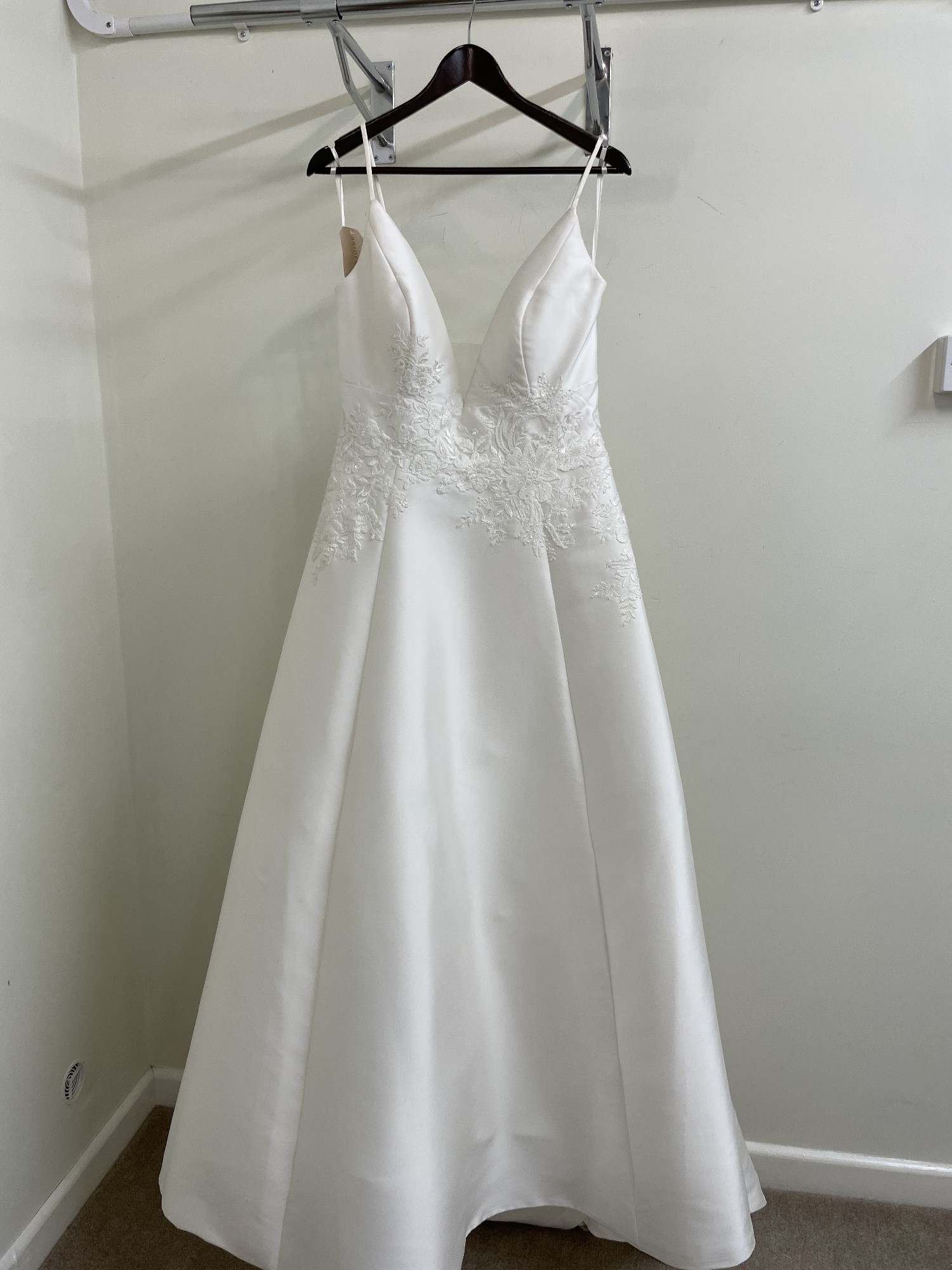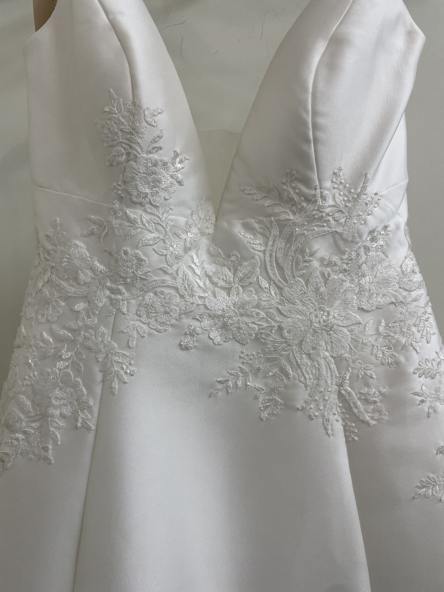 Mikado A-line with plunging bikini neckline and V-back accented with inset waistband at natural waist. Sequined lace appliques adorn bodice and cascade down skirt. Finished with pockets and Mikado covered buttons to end of sweep length train.