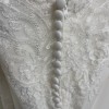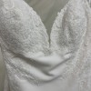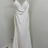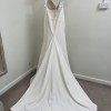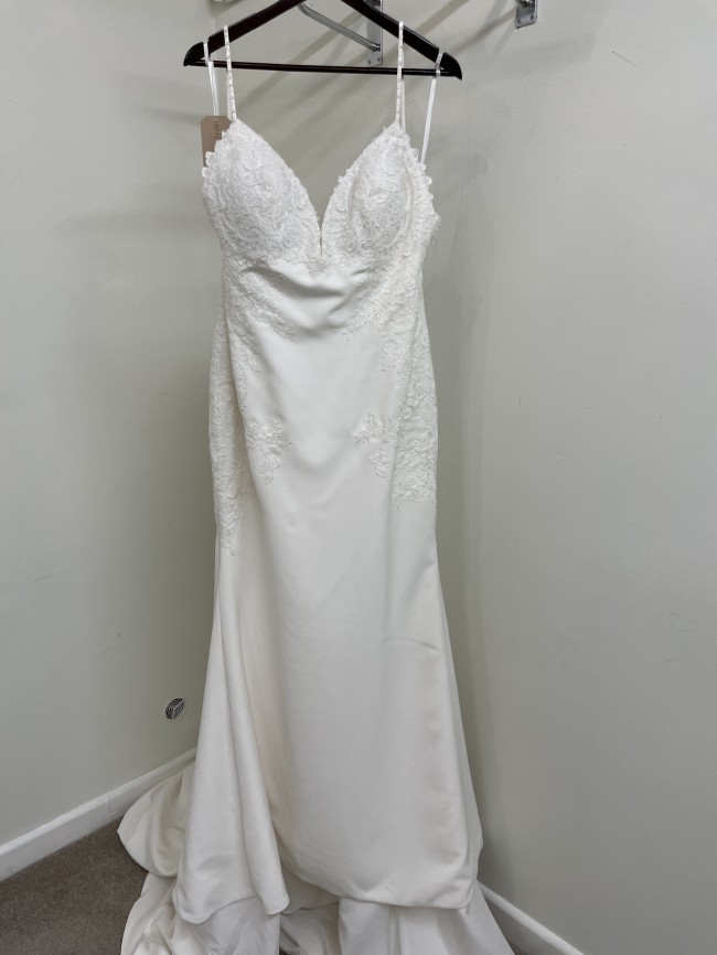 Stretch crepe fit and flare with deep bikini neckline and low back. Sequined lace appliques adorn bodice and continue down hips. Beading embellishes spaghetti straps. Finished with crepe covered buttons down back and a center godet on chapel length train