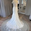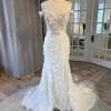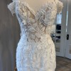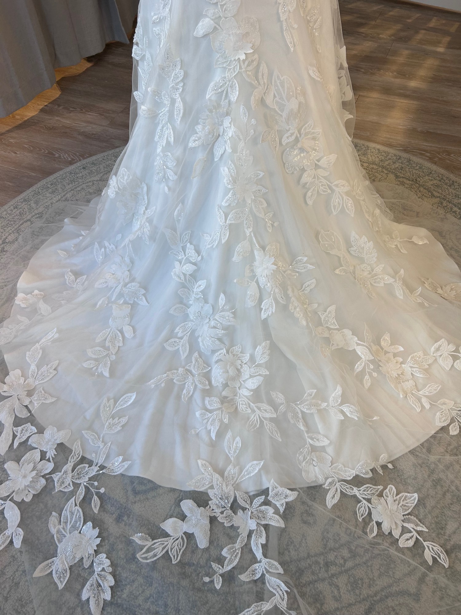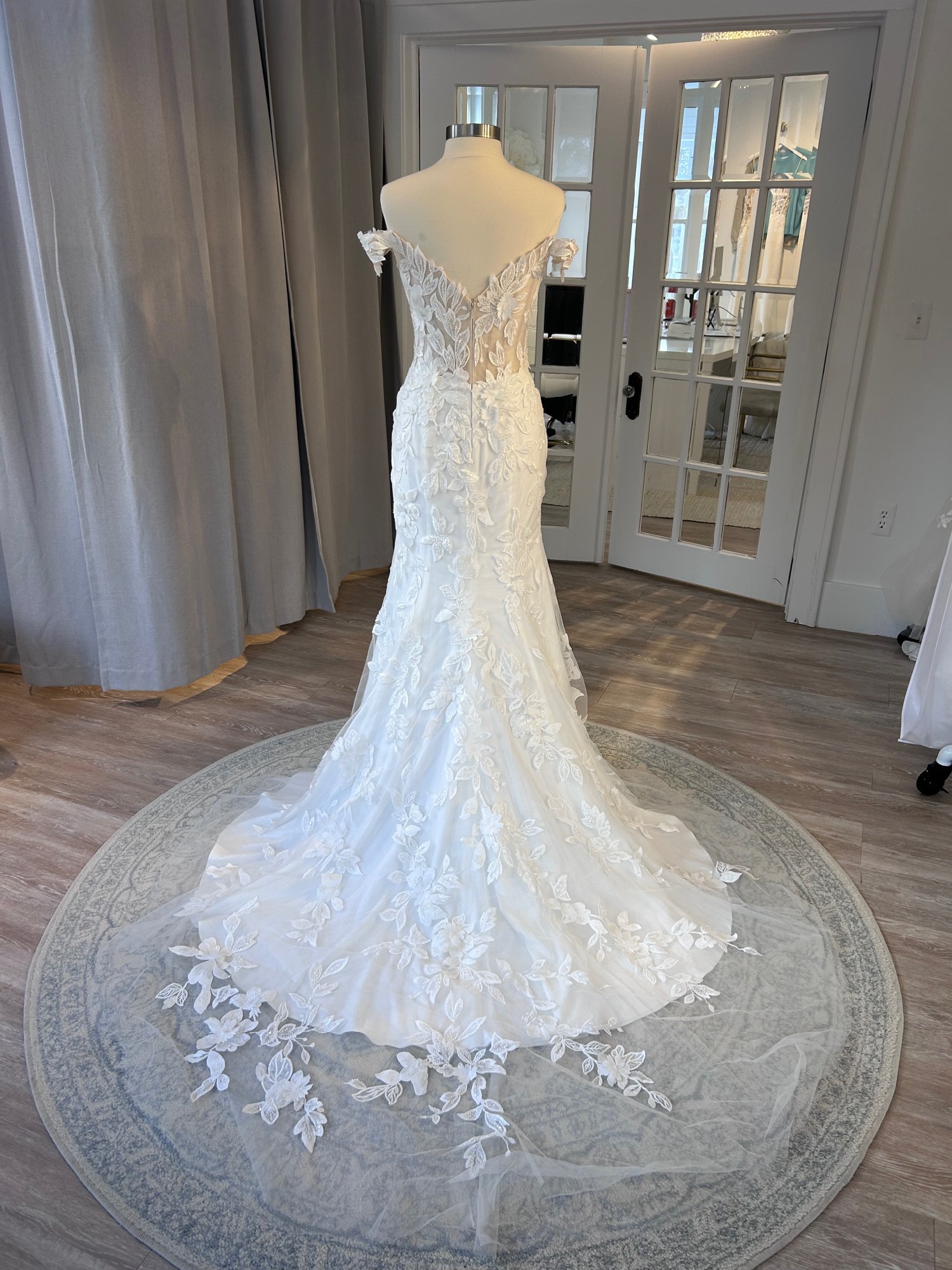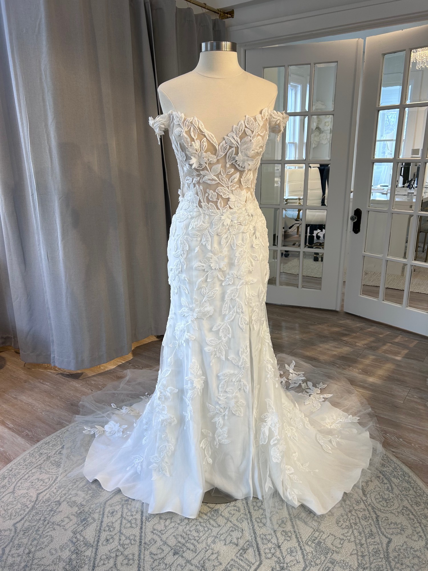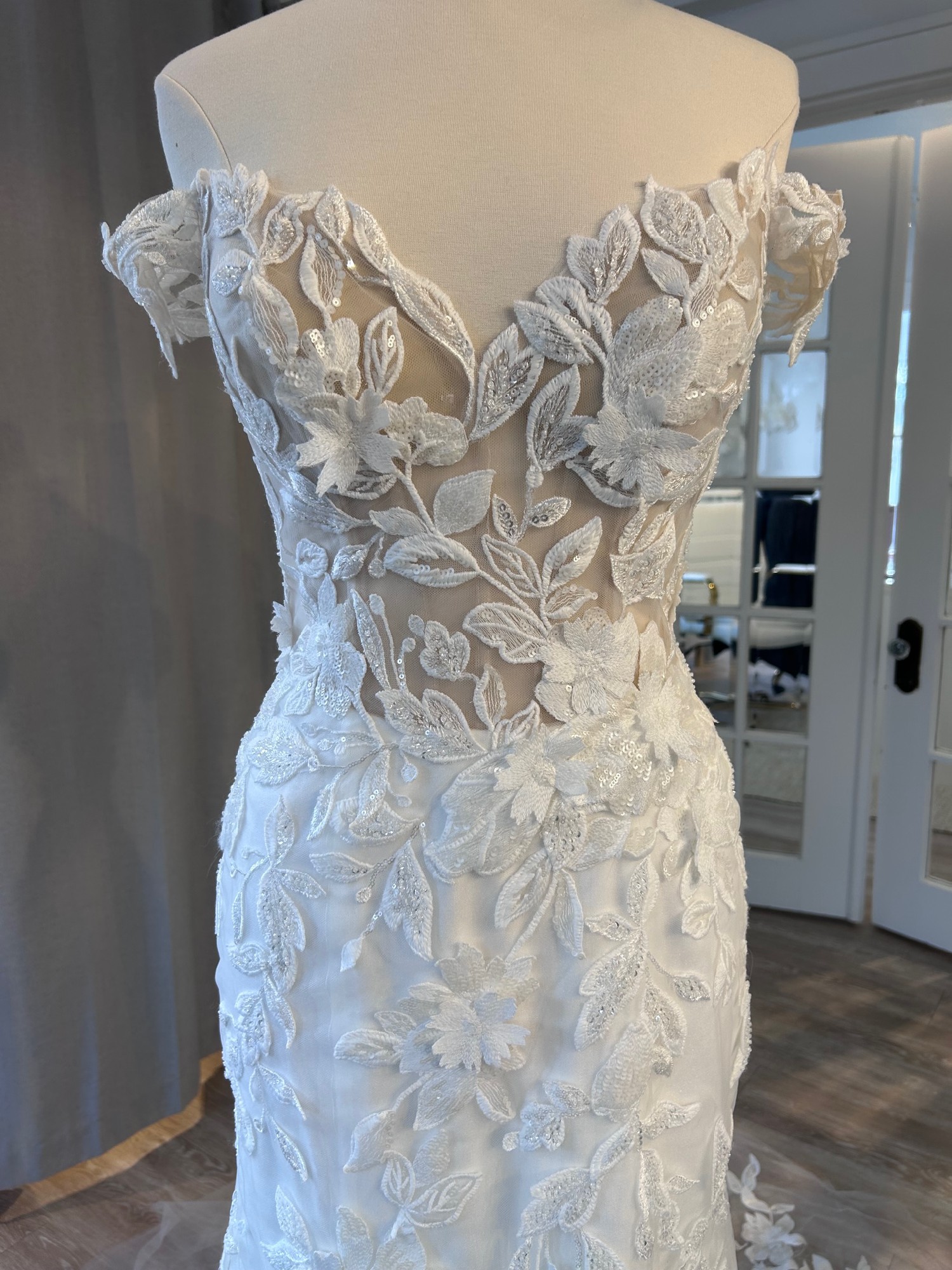 Casablanca Augustine - off the shoulder fit n flare with a sheer, boned bodice. Layer of chiffon over the top with embellished flowers and beaded lace. Color way is Ivory/Nude/Ivory. Never worn or altered, in excellent condition.