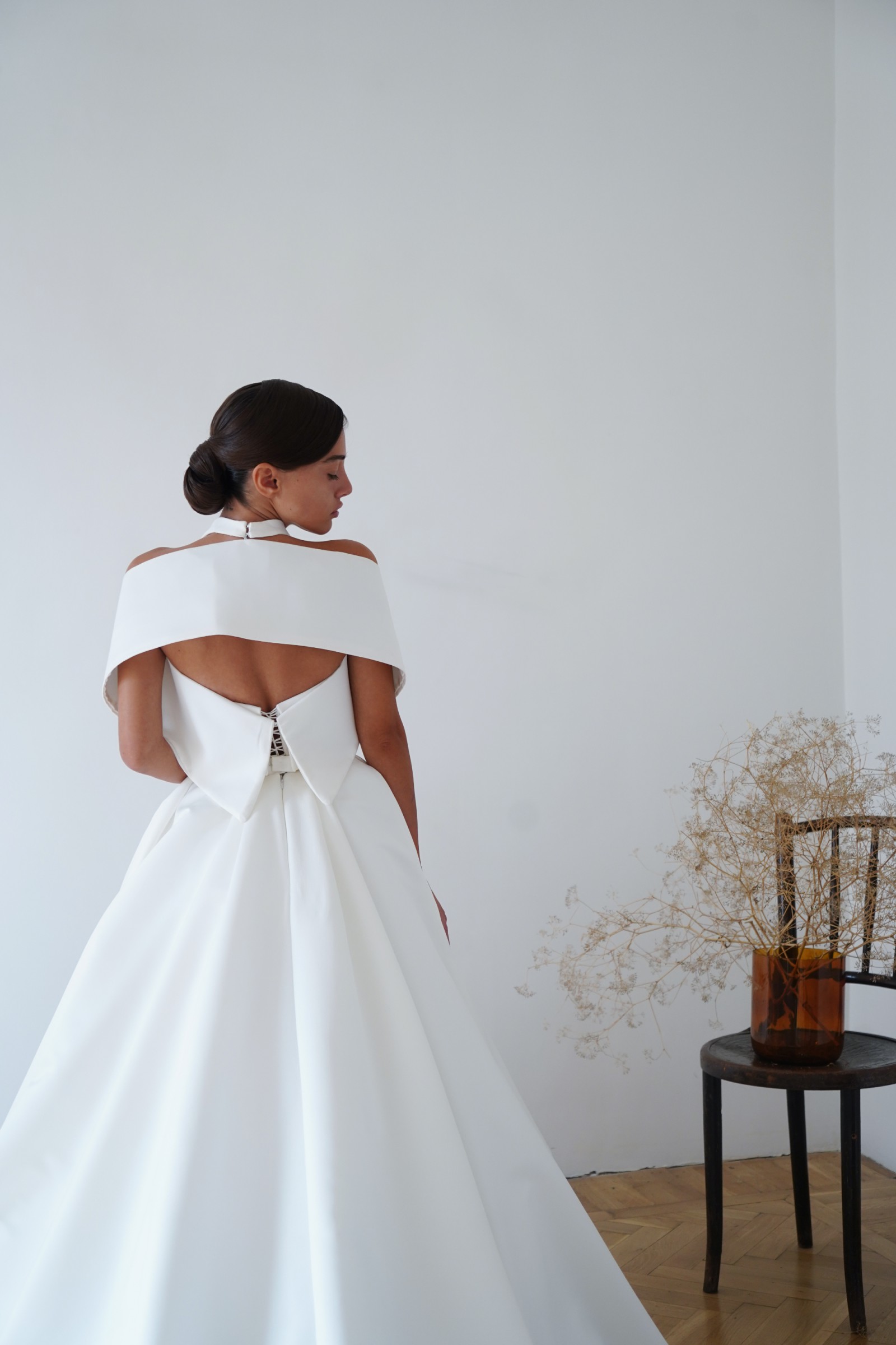 Elegant A-Line Wedding Gown with Modern Cape Detail