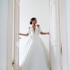 This modern A-line bridal gown combines timeless elegance with contemporary flair. Made from luxurious satin, it features a structured bodice with a plunging V-neckline and a statement removable cape that adds sophistication and versatility. The gown flows effortlessly into a full skirt with a chapel train, perfect for making a grand entrance.