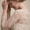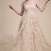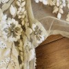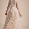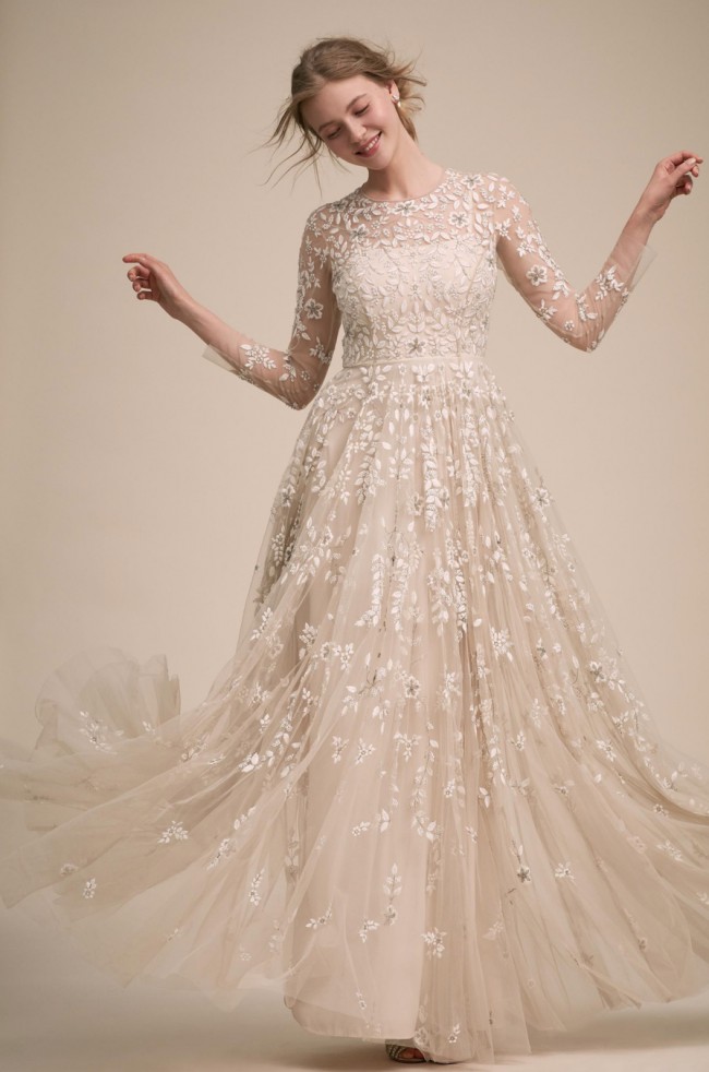Champagne tulle gives a lit-from-within glow to this stunning gown, featuring an illusion neckline and sheer sleeves. The ivory embroidery is embellished with tiny silver beads for added sparkle. Fitted at the bust and waist, loose at the hip. This dress runs small. Store size 6, but fits more like a 4. Back zip. I wore this at my winter wedding, and got so many compliments on this dress. I hope it can make someone else feel as beautiful on their day, as I did.