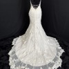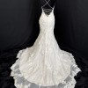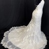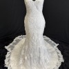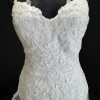 Chic and alluring, this tulle fit-and-flare features shimmering lace appliqués and bead detailing over Inessa jersey. Petal-shaped lace hemline. Gorgeous crisscross strap details accent the gown's open back, completing the shoulder strap V-neckline. Corset-backing can be modified in a variety of ways, crisscross at the top, crisscross on the bottom, both crisscrosses, and laced straight down along the sides for a fully open back. Having it designed this way should minimize the need for alterations to this part of the dress. The tails of the straps can be tucked into the dress or trimmed to size and/or hung loose with a bow. Finished with a zipper closure.