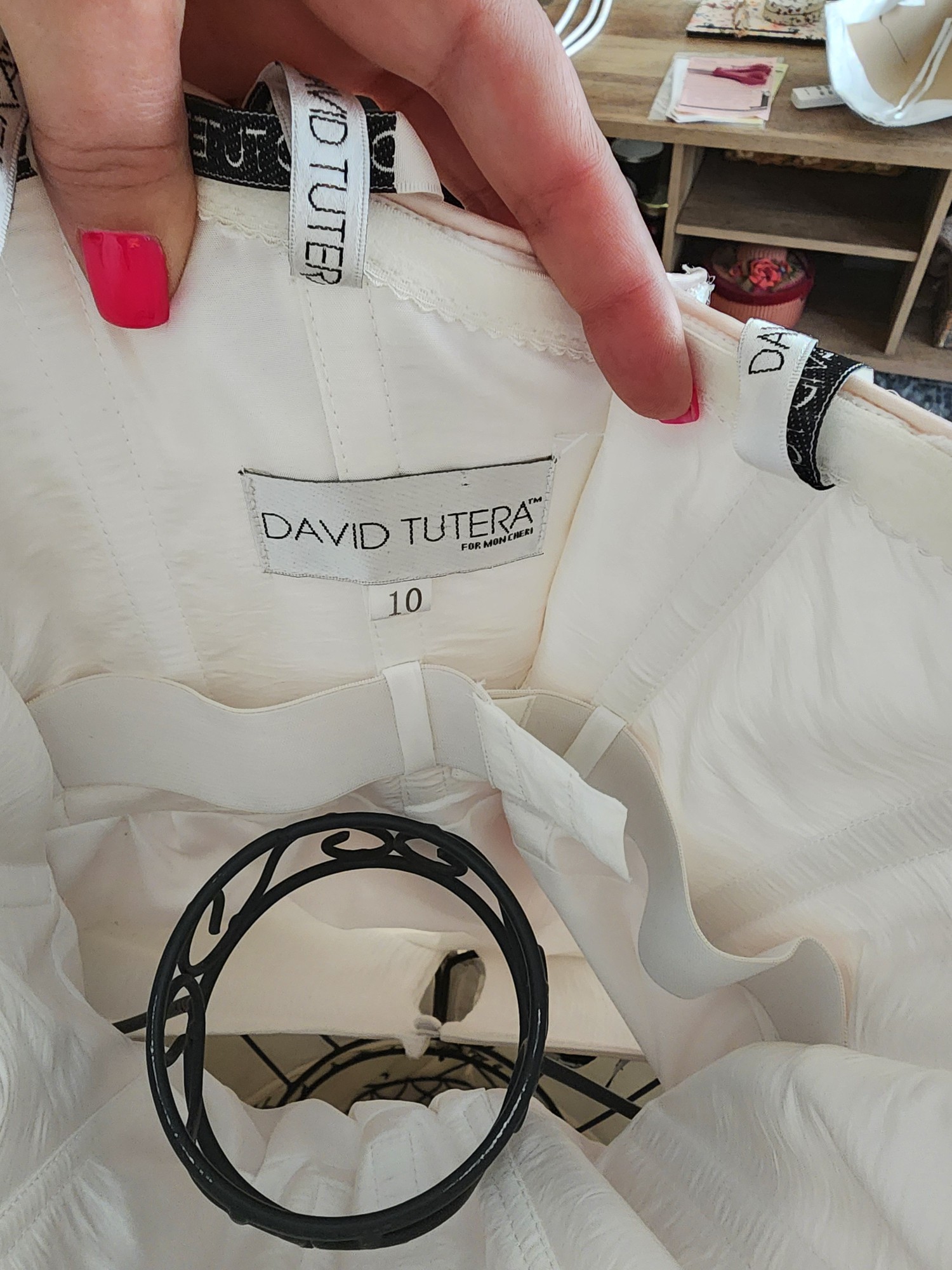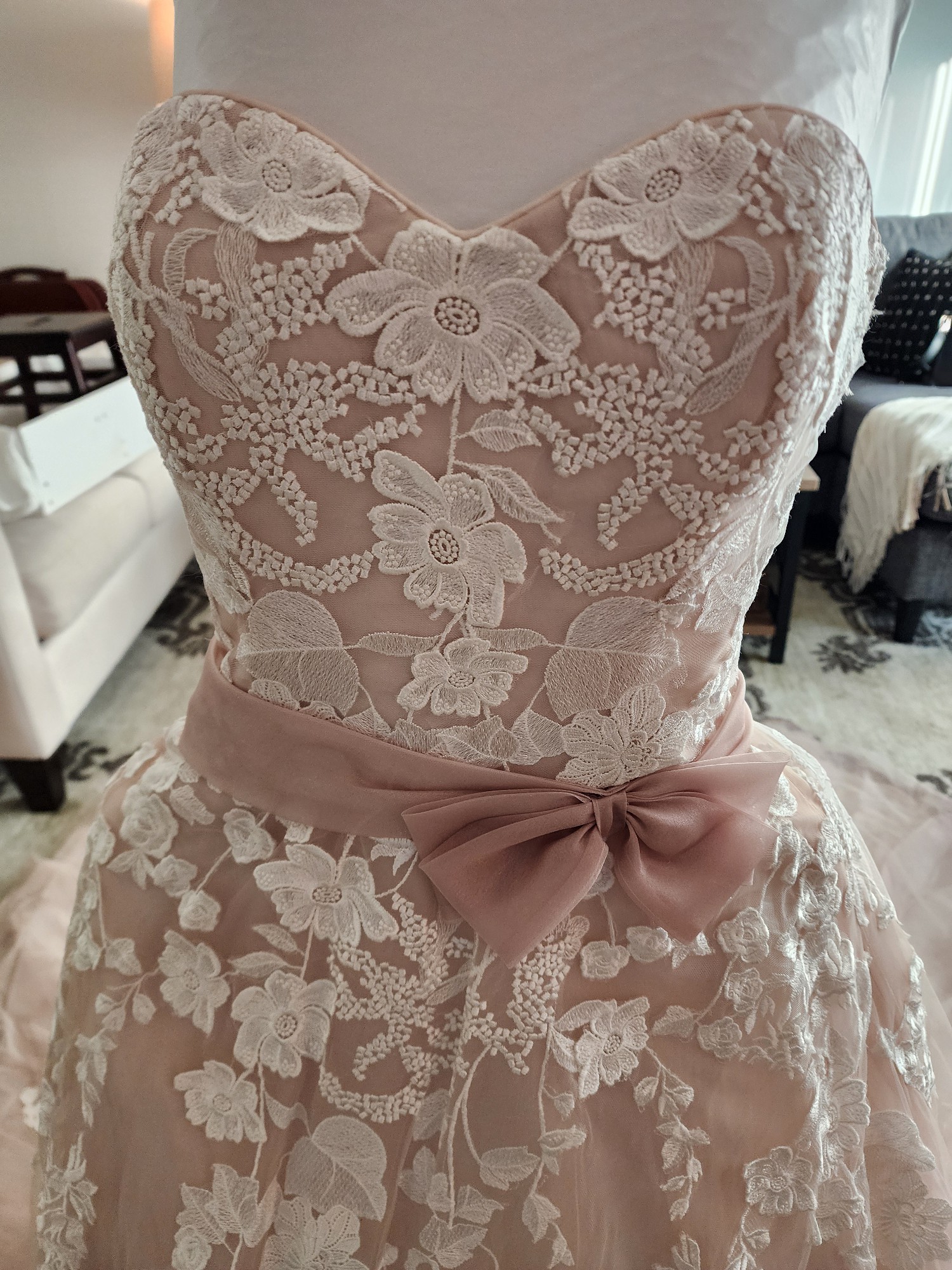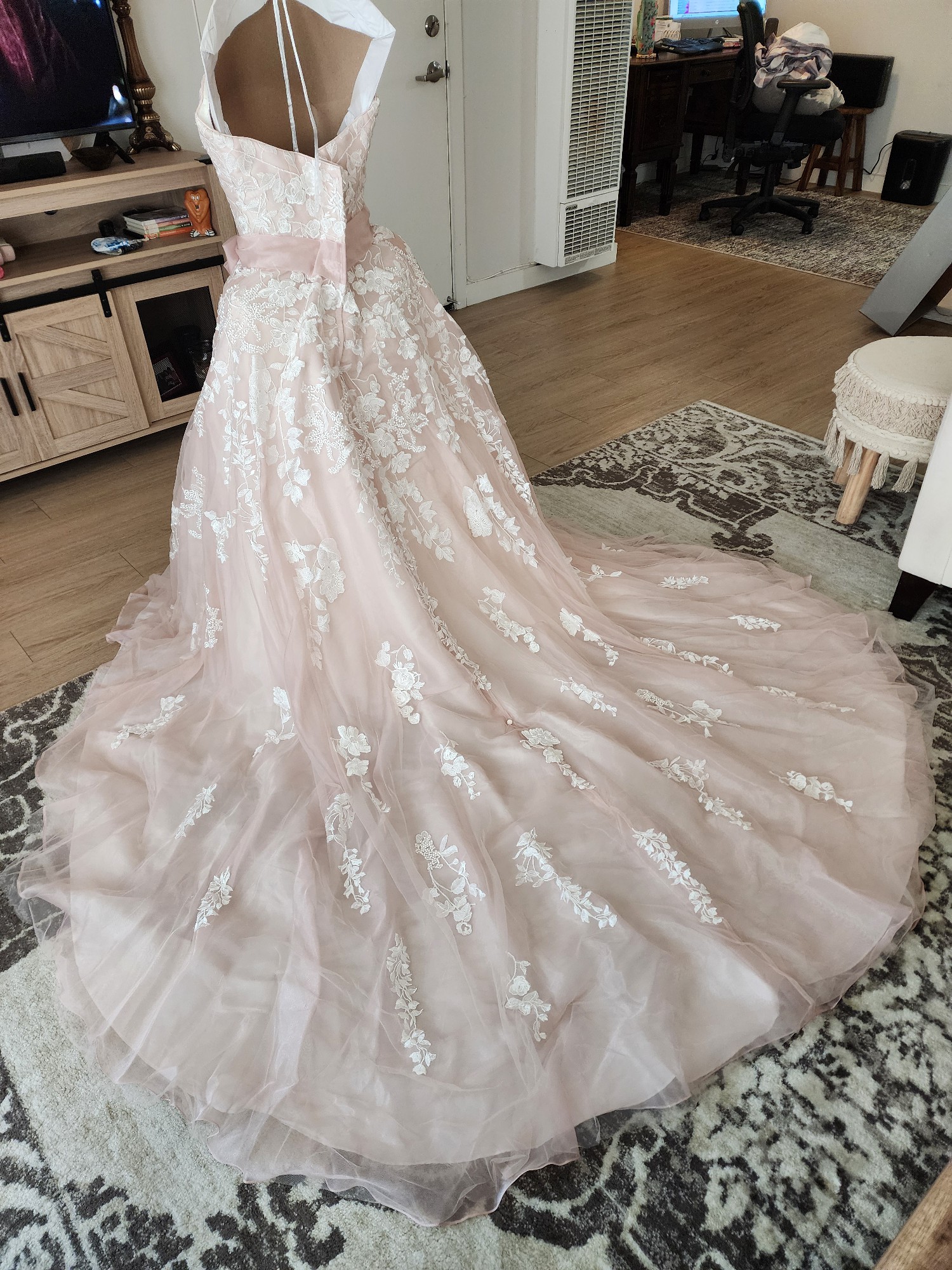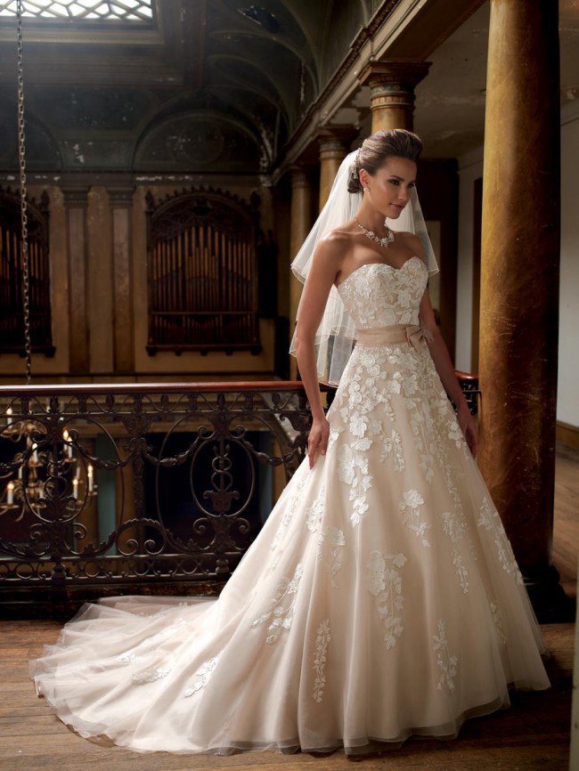 I absolutely love this dress! David Tutera "Hillary" 213247. Tea Rose/Ivory, chapel train.