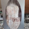 This dress has no stains, but I had it professionally cleaned anyway. It is still in the Keepsake sealed box which includes Nina Brand ivory 2.5 inch heal shoes size 8 and an ivory purse.