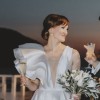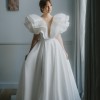 Featuring a dramatic, deep V-neckline on the front and back, the bodice is adorned with voluminous flounces that cascade over the shoulders, resembling delicate flower petals. The flounces are removable, and they can be taken off or worn on just one shoulder for a versatile look, or replaced with decorative pearls and beaded braids.