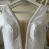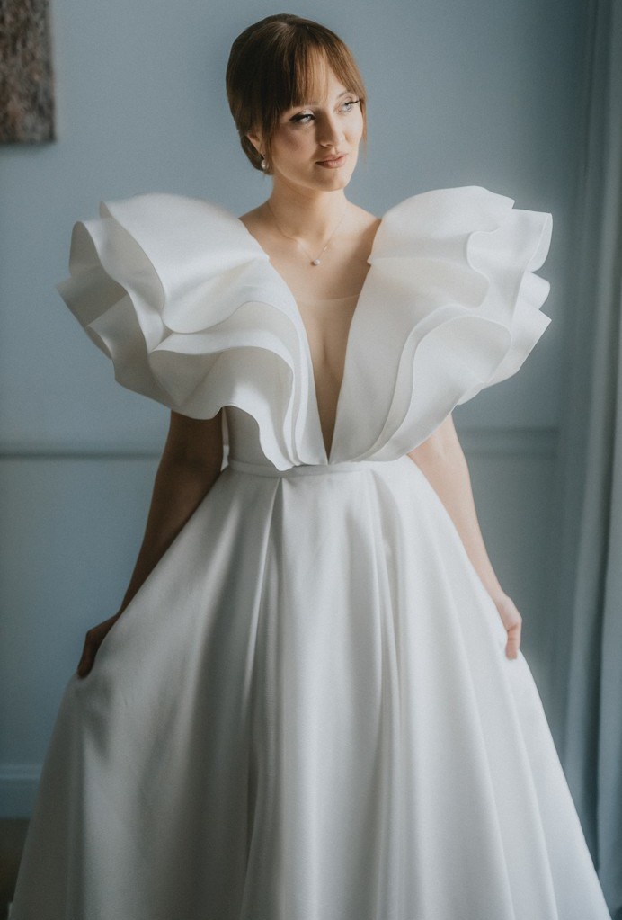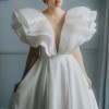 Dress of the fitted silhouette made of high-quality satin, ensuring a luxurious feel and impeccable draping. Wrap A-line skirt with a high slit. It also includes hidden pockets on both sides for convenience. The full, flowing skirt leads to the floor, creating a grand and unforgettable entrance. This contemporary yet timeless gown is ideal for a bride who wants to make a bold, sophisticated statement on her special day.