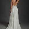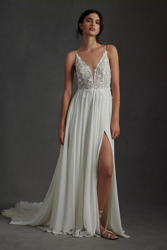 The Kelsey wedding gown by Jenny Yoo boasts intricate semi-sheer floral lace atop a deep-v bodice, with an illusion panel for structure. An ethereal, flowing skirt cascades to the floor, and a front-left slit adds dramatic allure.