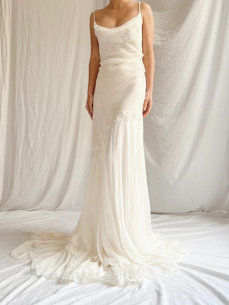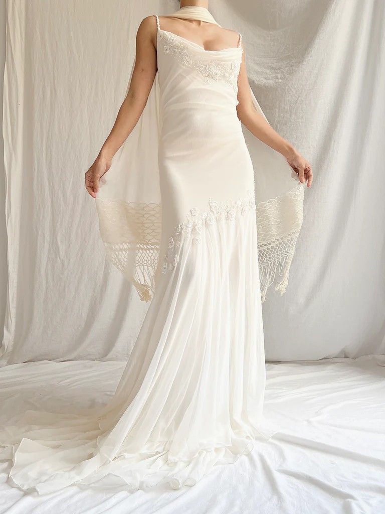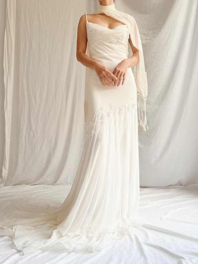 The gown is chiffon, cut on the bias, and features beaded details. Scarf is included! It's an absolutely stunning vintage piece that would be perfect for a summer/garden/destination wedding — I just ended up going with a different option to better match what my partner was wearing.