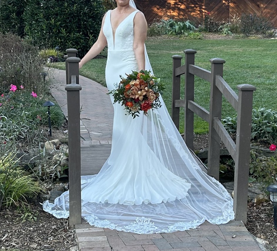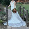 This breathtaking Justin Alexander Cora wedding dress was my absolute dream for my special day. The timeless trumpet silhouette beautifully accentuated my curves, while the elegant V-neckline added a touch of sophistication that made me feel like a queen.