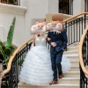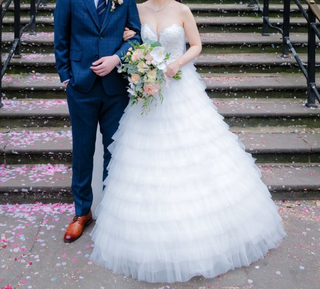 A stunning, strapless ball gown style with a fitted bodice and a voluminous skirt.