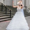 The skirt is made up of multiple layers of tulle, with cascading ruffles, giving it a fluffy, cloud-like appearance that adds a dramatic flair to the gown.