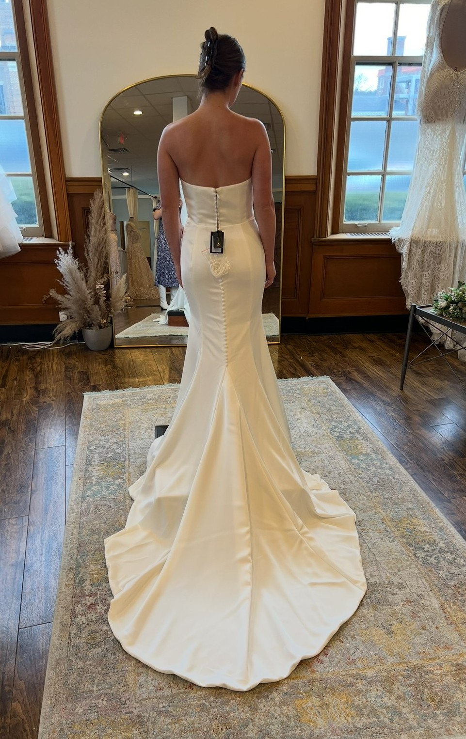 - Bustle added to reinforce the buttons down the back of the dress