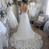 This A-line dress with chiffon skirt features a plunging illusion Sabrina neckline, sequined lace appliqués, Chantilly lace underlay, and a sexy V-back with covered buttons cascading down to the train.